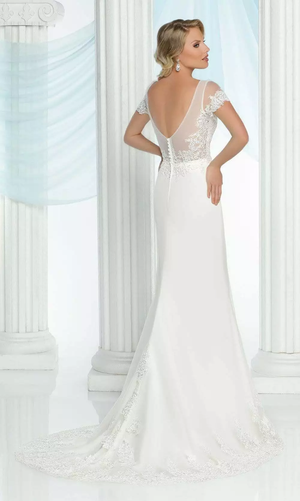 | Details: | Short sleeves, Illusion, Embroidery, Fitted bodice, Open back, Buttons, Sweep train, Lace |