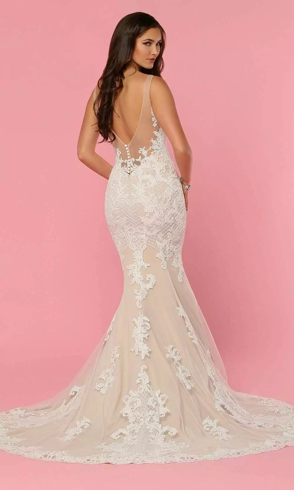 | Details: | Sleeveless, Sheer yoke and mid-bust, Fit and flare, Enclosed sheer back, Bridal Buttons, Hidden back zipper, Chapel train |