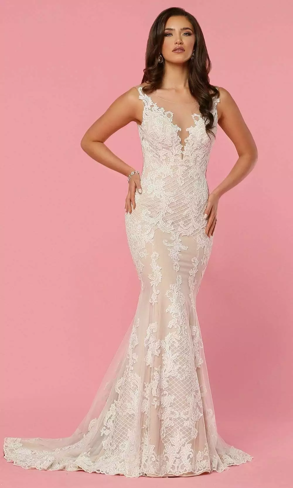 Enter the chapel and bask in the awed expression of your man in this Da Vinci Bridal 50445 Wedding Dress. Trailed with foliage embroidered lace appliques and beadings on its fit and flare silhouette, this tantalizing piece flaunts an illusion plunging V-neckline atop a fitted bodice. Sheer straps trail to connect its low v-open back with bridal themed covered button and hidden zipper detail at the center. The softly flared mermaid skirt finishes with a beautiful cascade of chapel length train. Be the stunning vision on your special day in this Da Vinci Bridal Bridal masterpiece.