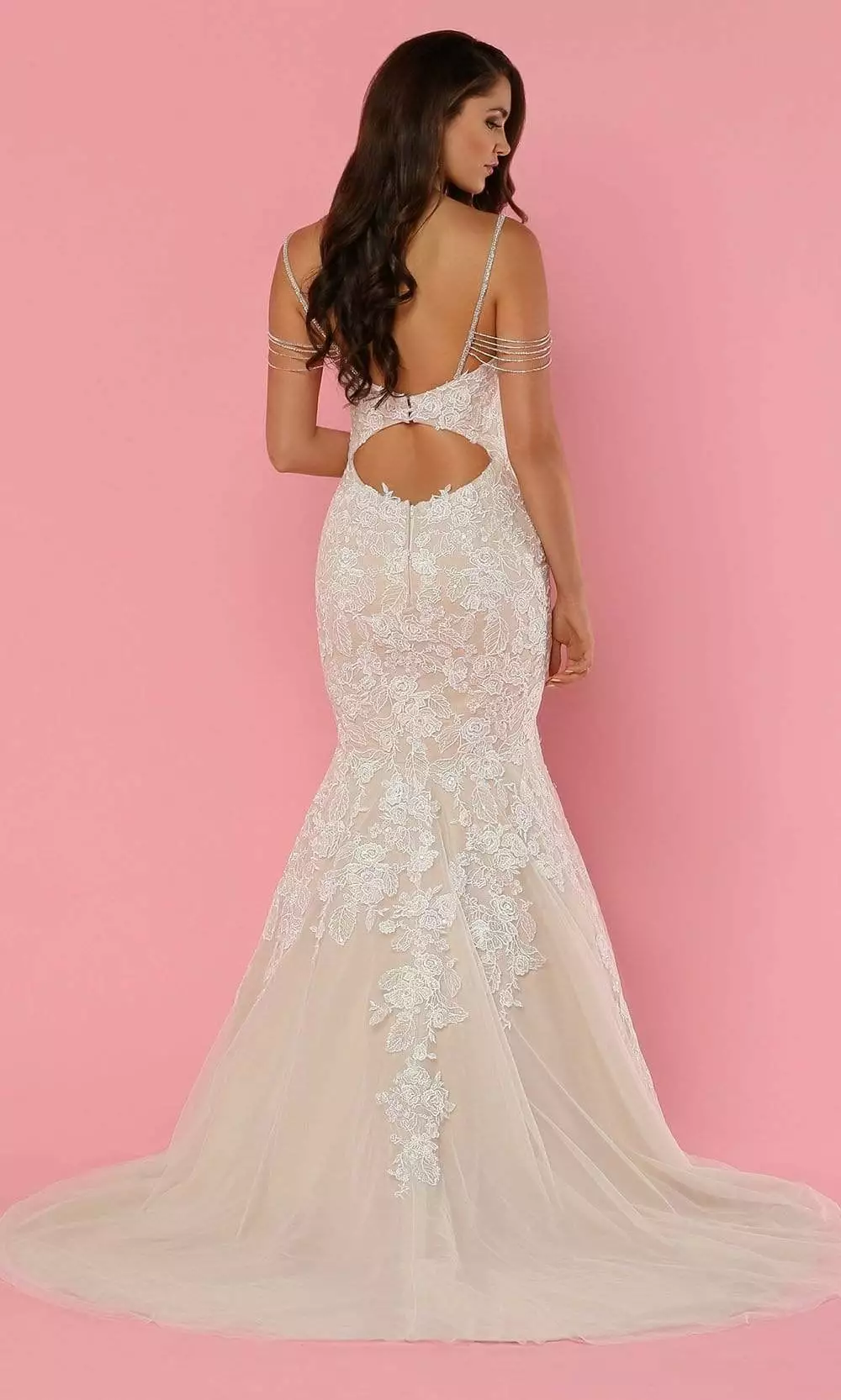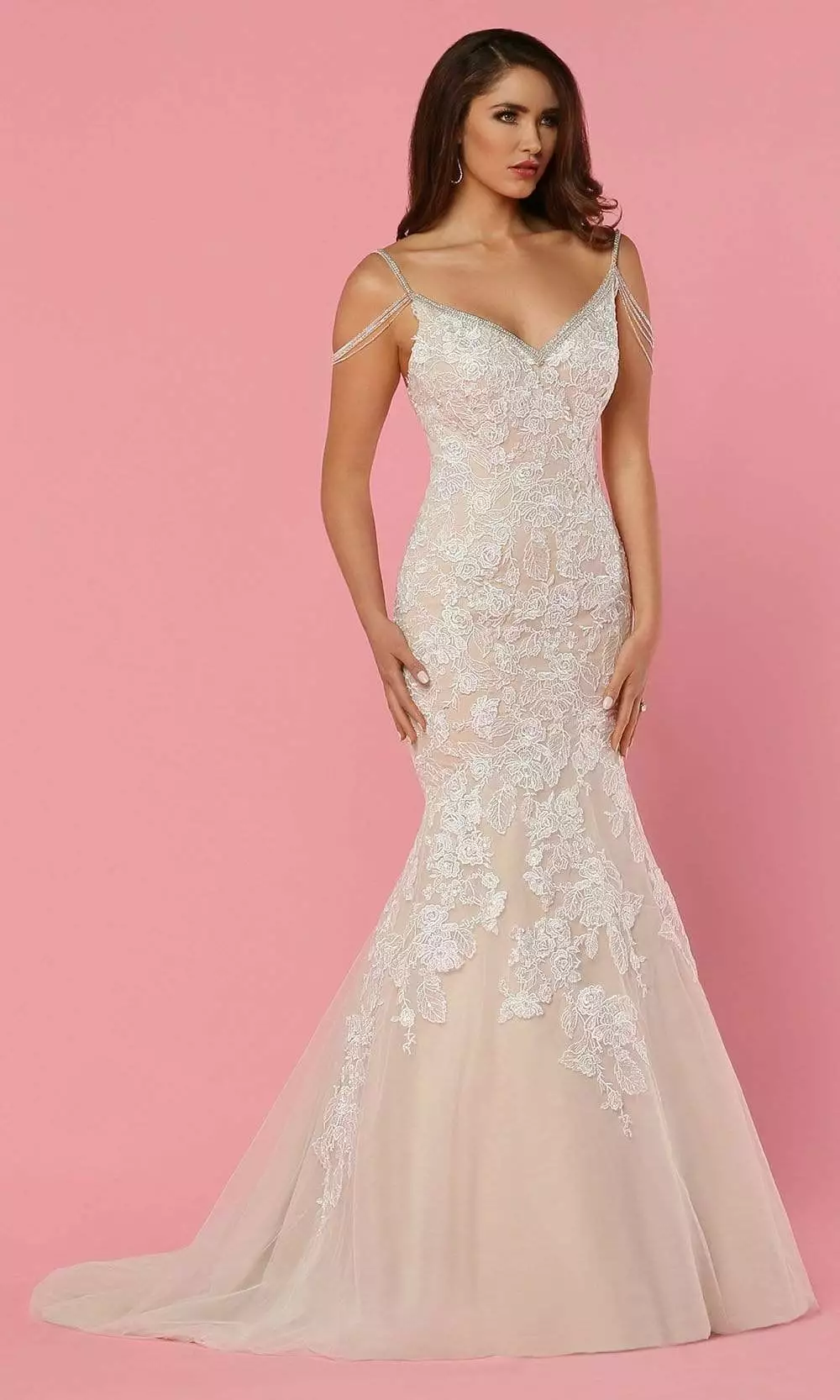 The romantic journey has just begun in this sophisticated gown by Da Vinci Bridal 50462. Beautifully crafted in delicate tulle with lavish embroidered lace applique, this classy piece features a beaded trimmed V neckline over a form-fitting bodice with rhinestone beaded shoulder straps and off-shoulder accent. The mid-open back features an alluring cutout leading to the skirts fit and flare mermaid silhouette that beautifully finishes with a chapel train. Make a lasting impression at your wedding day when you wear this Da Vinci Bridal creation. Model is wearing Ivory/Champagne color.