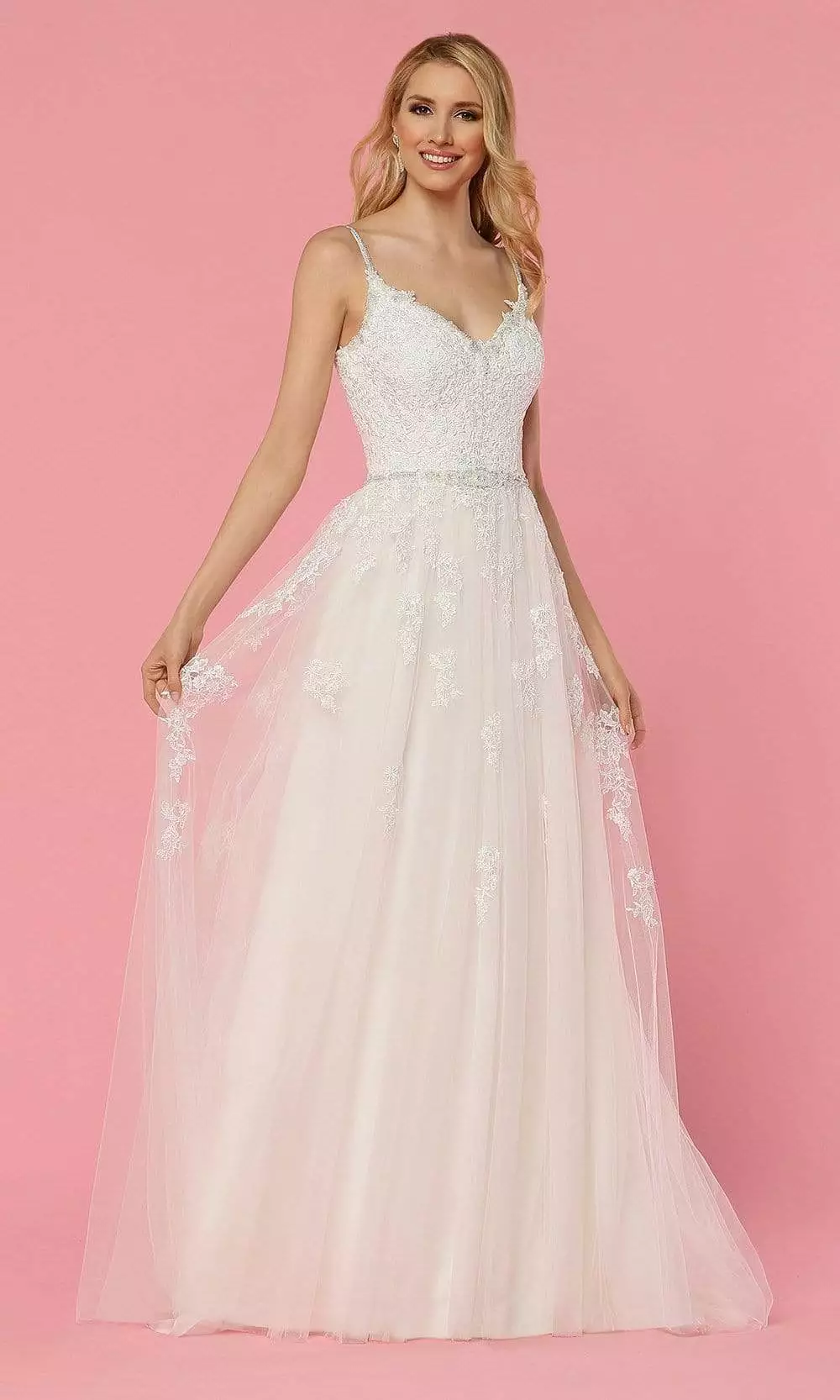 Da Vinci Bridal 50464 wedding dress, making it perfect for the modern bride with a timeless sense of style. Look mesmerizing in this V-neck dress featuring a Tulle and Lace A line. Accented bodice in beaded lace design in straps accenting a low scoop back all wrapped in a Tulle with lace detailing that ends in a subtle Chapel Train. Da Vinci Bridal wedding dress offers dreamy elegance in a classic A-line silhouette.