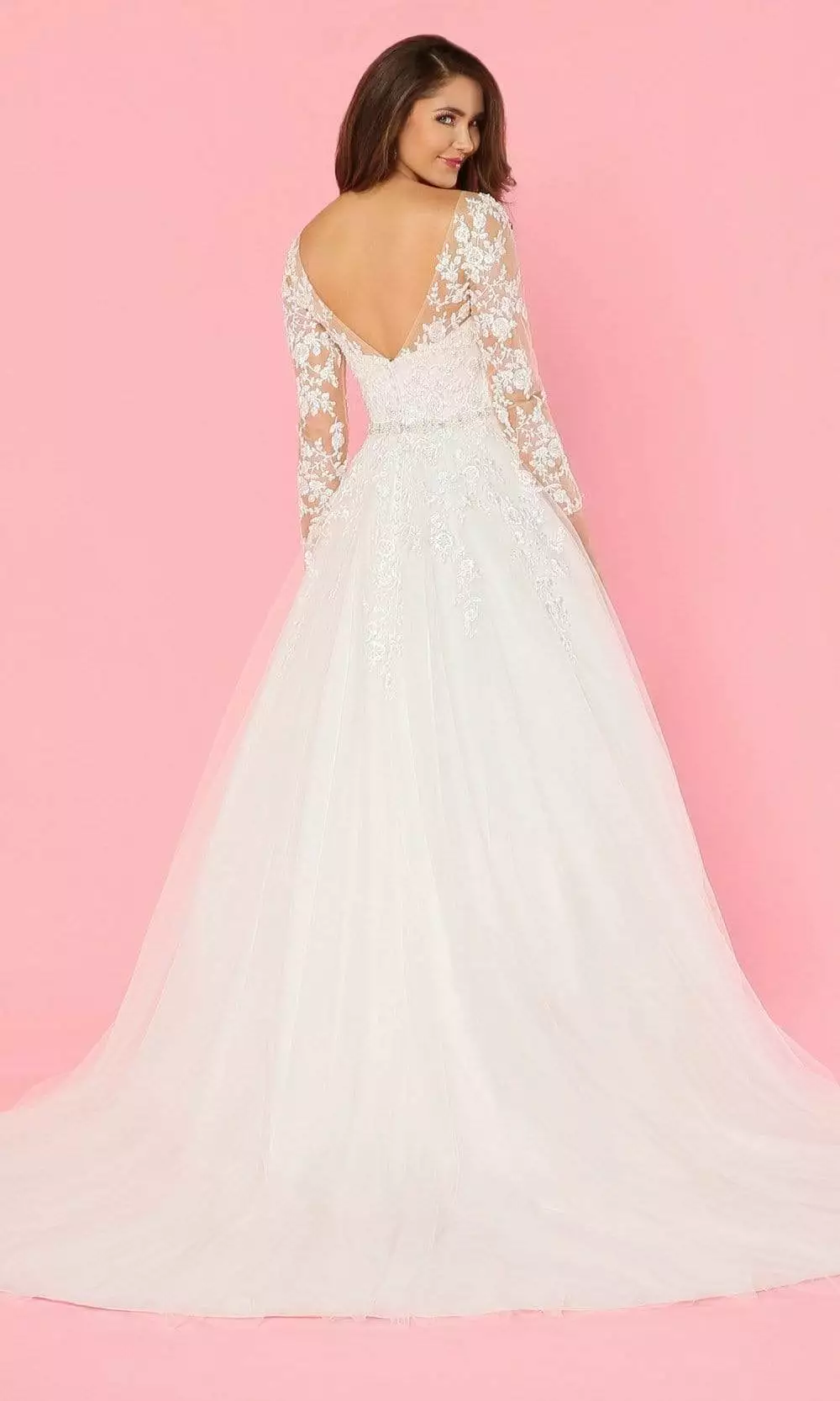 Be the loveliest bride with this classy Da Vinci Bridal 50470 Wedding Dress. Luxurious Tulle with embroidered lace applique bridal dress featured with an illusion neckline and long sleeves that brilliantly frame the sweetheart shaped fitted bodice. The back shows off a sheer V shaped secured at the center with zipper closure. The dress is formed with natural waistline accented with sparkling beaded band while the skirt fabulously opens up in elegant ballgown silhouette and ends in chapel train. This Da Vinci Bridal Bridal gown is perfect for the bride with a classic sense of style. Model is wearing Ivory/Ivory color.