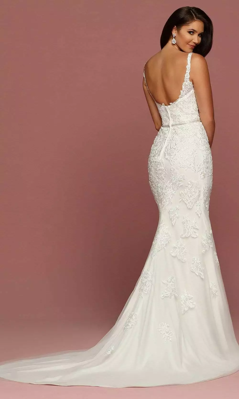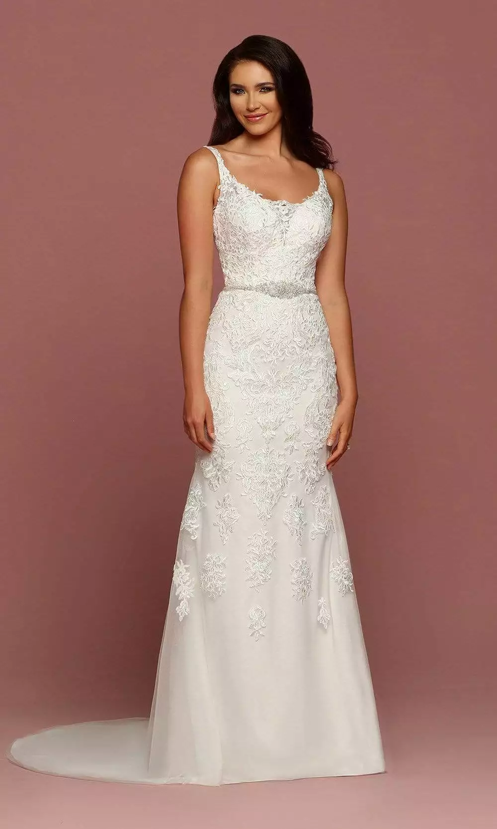 Take your seat on the throne in a queenly gown from Da Vinci Bridal 50493. Look alluring in a Tulle and Lace wedding dress in a simple, sophisticated scoop neckline, open back wrapped in lace applique to its body and to its straps. Wrap in silver beaded waistband as it falls into a lovely skirt in lace applique that elegantly ends in a Chapel Train. Da Vinci Bridal wedding dress boasts undeniable glamour in a chic silhouette.
