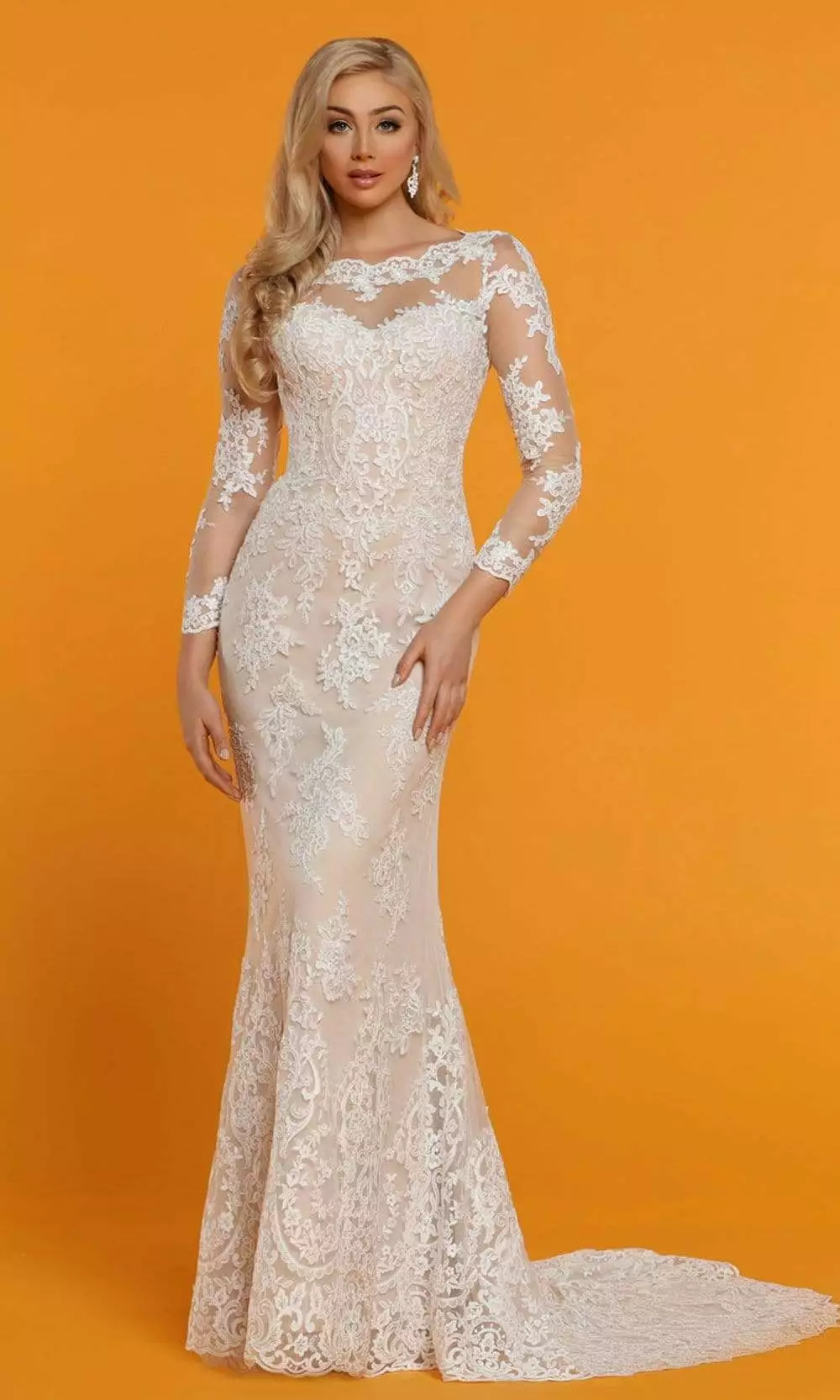 Brandish a style on your most awaited day that speaks of impeccable elegance in Da Vinci Bridal 50516 Wedding Dress. This tulle wedding gown is embellished with filigree lace appliques, flaunting a form fitting bodice with scallop trimmed bateau neckline, sheer long sleeves and a sheer decolletage that tops the sweetheart lined bust. Equally alluring is the back with a double cutout style, accented with bridal themed covered buttons at the center. Crafted with a solid lining, the sheath skirt flows while it smoothly traces the curves of the hips and drapes into a full-length hemline with a chapel train. Flourish an elegance that glows on your wedding day wearing Da Vinci Bridal Bridal creation.