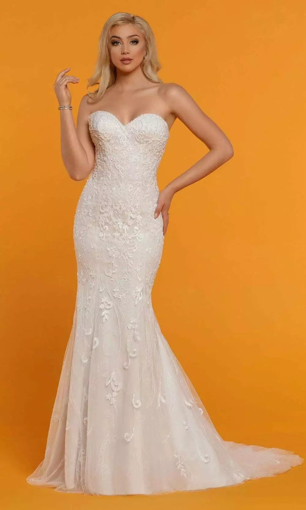 Engage pure glamour on your wedding day in this stunning Da Vinci Bridal 50518 Wedding Dress. This fabulous ensemble is tailored in luxurious tulle with beautiful lace appliques while lavish embellishment of beadings and sequins is added to let you sparkle in beauty. Showcases a strapless sweetheart neckline, mid-open back with hidden center zipper, and a form-flattering mermaid style skirt with a captivating chapel train. Leave a lasting impression when you don this ultra-chic Da Vinci Bridal Bridal creation.