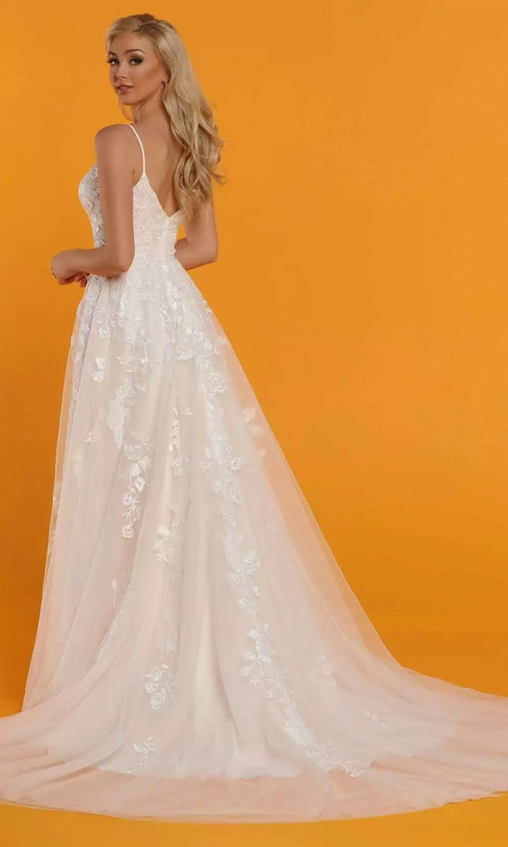 Mesmerize everyone with your charming presence in this enthralling wedding dress by Da Vinci Bridal 50536. A beautiful floral lace on tulle wedding gown showcasing a sleeveless fitted bodice with peaked sweetheart neckline and V back with spaghetti strap support from the shoulder. A thin band marks the natural waist and leads to the elegantly layered tulle A-line skirt, completed with a sweep train. Let this Da Vinci Bridal dress take you to the start of your beautiful journey ever after.