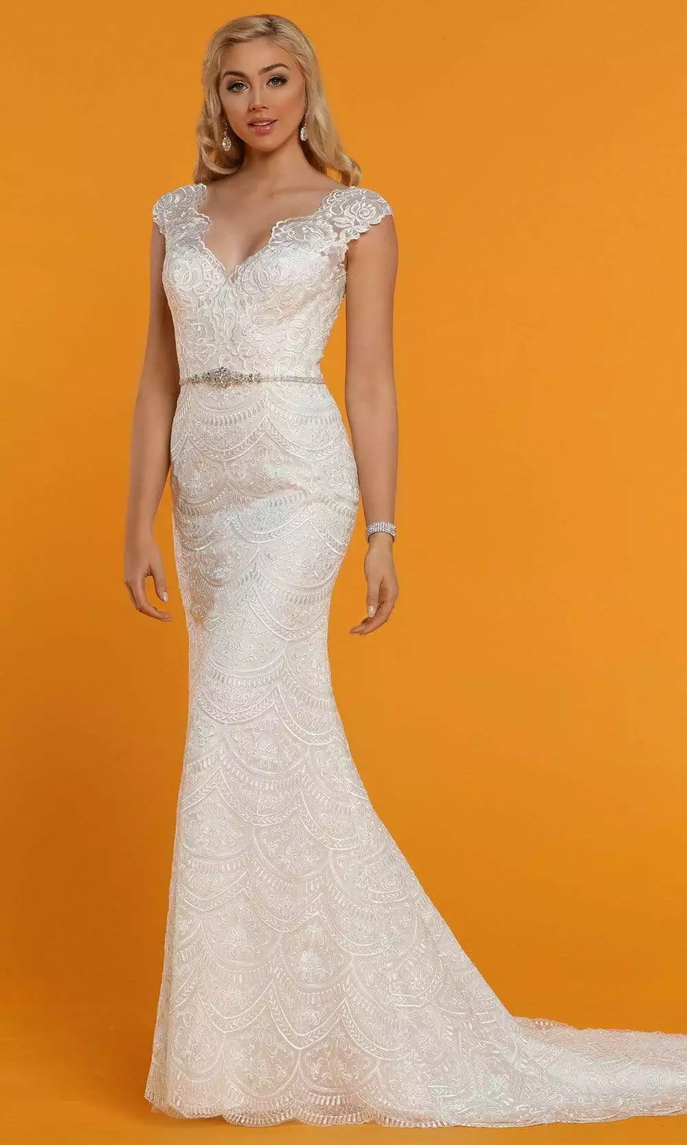 This wedding gown from Da Vinci Bridal 50540 is perfect for photos. This sophisticated Tulle & Lace Wedding Dress features a floral Lace Bodice in a V-Neckline with a Sheer Wideset Straps. Sheer back in Lace detailing with Covered Buttons. Wrapped in a beaded waistband, this Scalloped Lace Fit & Flare Skirt finishes in a beautiful Chapel Train. This Da Vinci Bridal wedding dress is a thoroughly modern choice for a bride who values a personalized, high-fashion wedding over a purely traditional one, the dress’s details styling you radiant at the center of attention on your wedding day.
