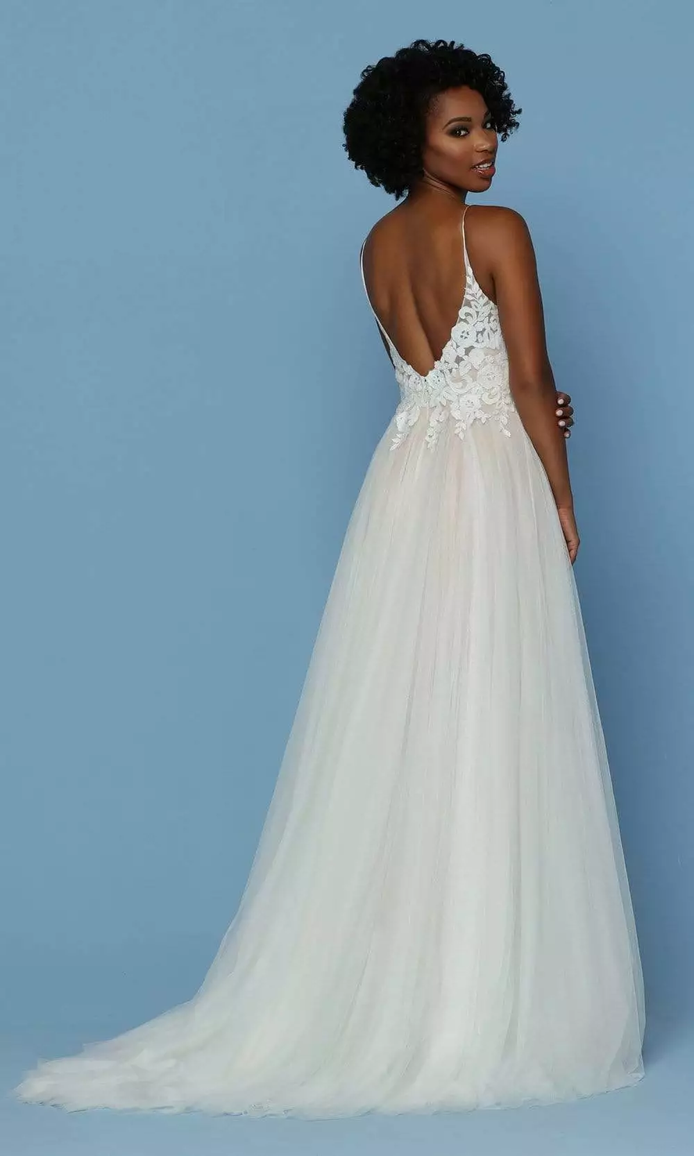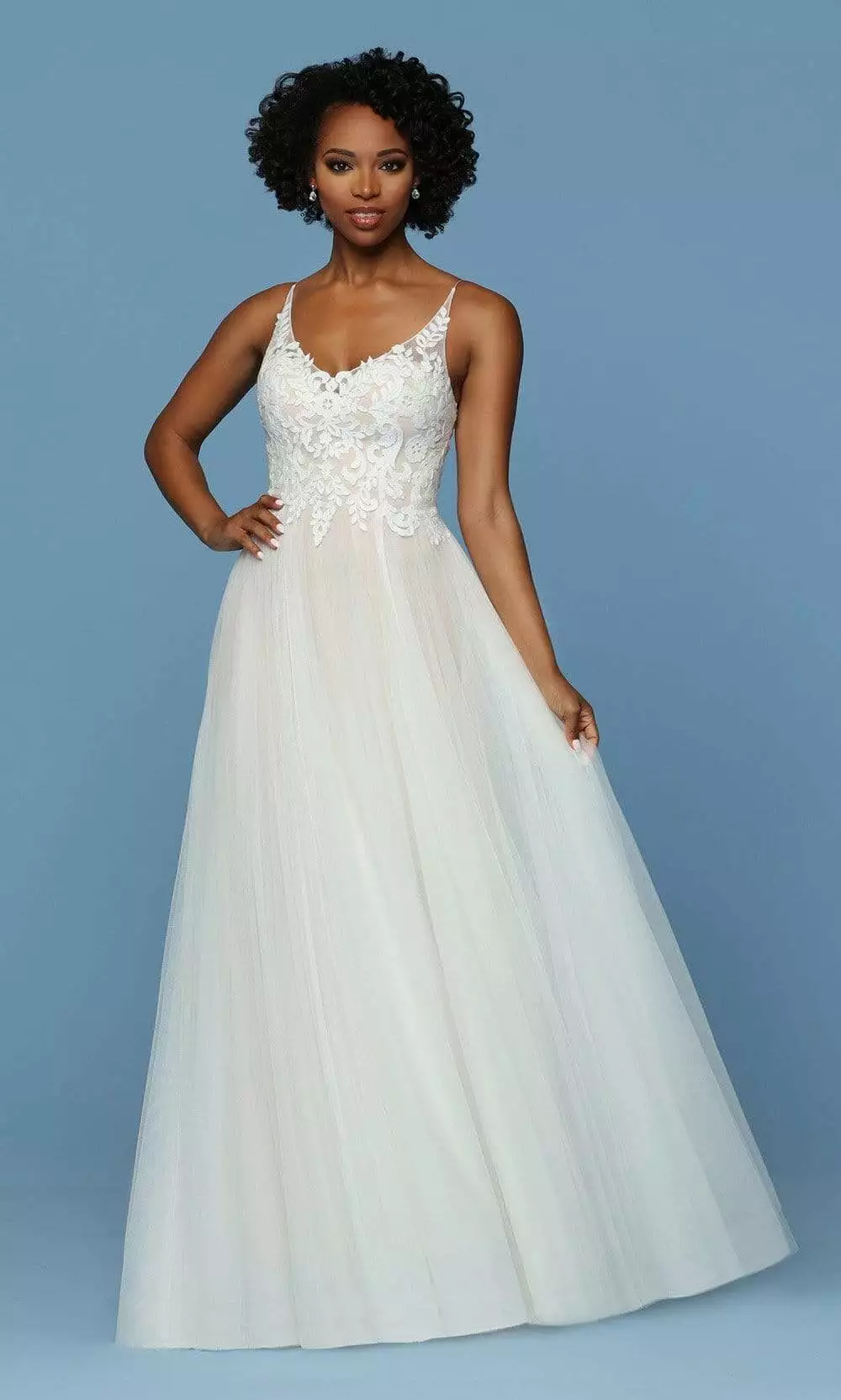 This Da Vinci Bridal 50552 wedding dress perfect for the bride who wants a romantic, ethereal look for her wedding day. The elegant sleeveless bodice is beautifully crafted in filigree lace, showcasing a V neckline paired with a low scoop back while spaghetti strap lend support from the shoulder. The gown parades in a full A-line silhouette of luscious gathers of tulle that finishes with a chapel train. This Da Vinci Bridal wedding dress evokes the spirit of timeless romance that so many modern brides desire for their wedding day.