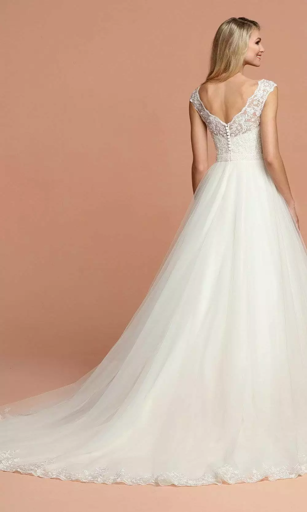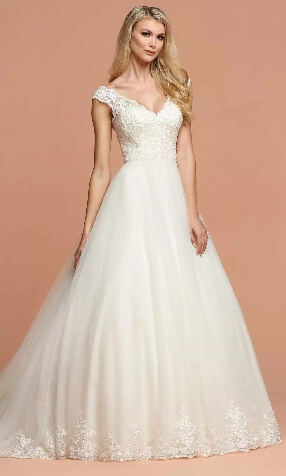 Every bride dreams of this beautiful gown from Da Vinci Bridal 50584. Mesmerizing Tulle A-Line Ball Gown Wedding Dress embed in Lace Bodice featuring a V-Neckline Wide Lace, Off the Shoulder Straps. Open Back with Button Accent and Beaded Waistband. Wrapped in a beautiful Smooth Layered Tulle Skirt and subtle lace detailing on Chapel Train. This Da Vinci Bridal design is ideal for the bride who wants to exude classic sophistication while living out her modern-day fairy-tale.