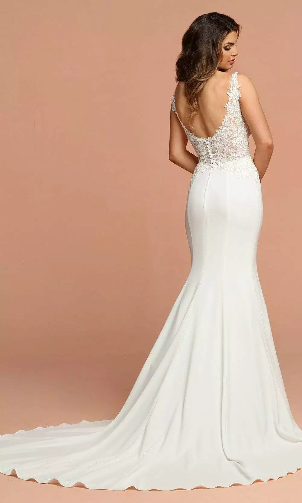 Walk in this stunning piece by Da Vinci Bridal 50592. This long lace gown enchants in a sleeveless, plunging V neckline with a fitted bodice and a scoop back. The bodice is styled with covered buttons at the back. The soft crepe skirt is tailored in a mermaid silhouette with a chapel train. Make it your moment to shine in this lavishly embellished Da Vinci Bridal gown. Model is wearing Ivory/Nude color.