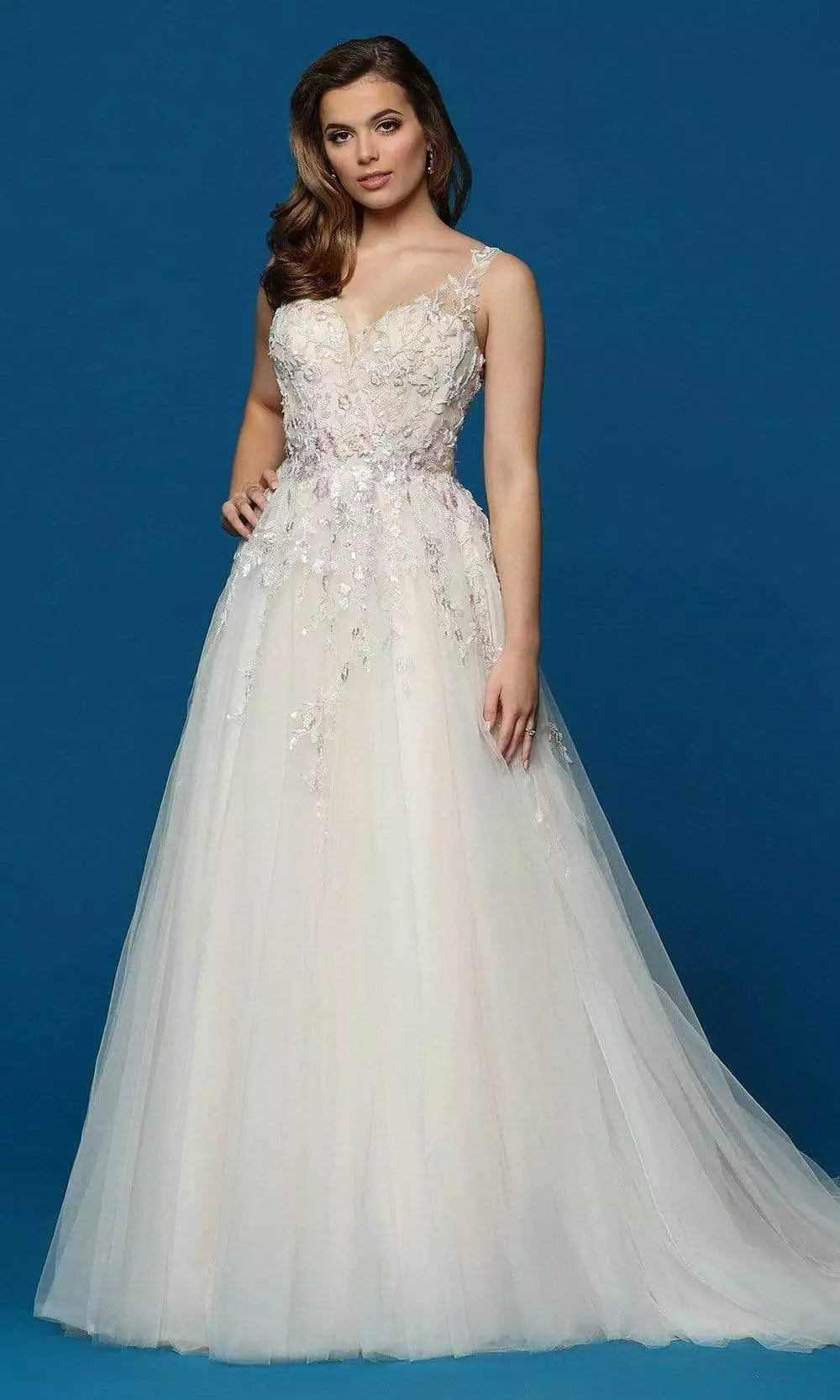Demand undivided attention on your wedding day in this Da Vinci Bridal 50630 creation. Adorned with floral and beaded details, this gown charms with an illusion v-neckline with a sweetheart lining. Buttons trail down the illusion back as the skirt crafts a refined A-line silhouette with a train. Lavish in the mesmerizing elegance of this Da Vinci Bridal masterpiece.