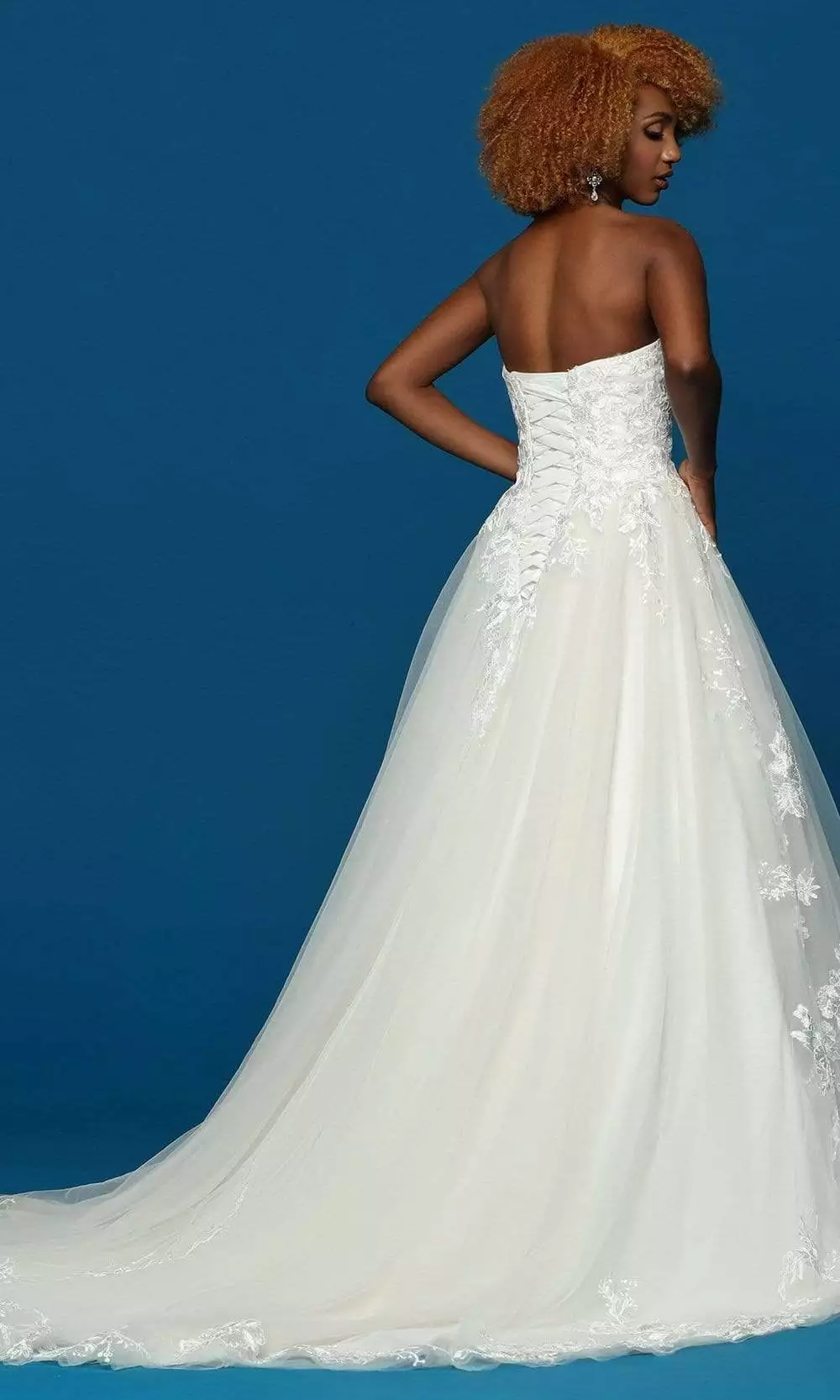Fall in love with the beauty of this Da Vinci Bridal 50634 creation on your wedding day. Flourishing floral details streaming from the strapless bodice, this gown reveals a scoop neckline coupled with a corset back. Floating with an ethereal style, the skirt traverse into an A-line silhouette with a court train. Leave them captivated in this Da Vinci Bridal masterpiece.