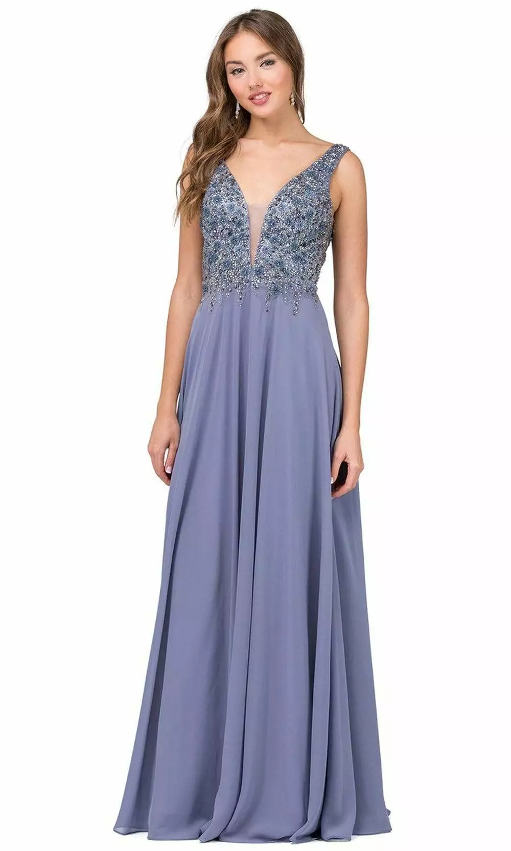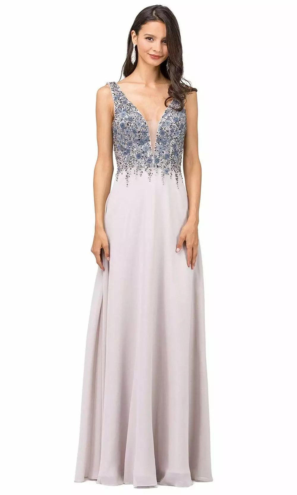 Turn yourself into a head-turning beauty by slipping into this absolutely eye-catching dress. Features a sleeveless, plunging V-neckline with sheer insert, the fitted bodice is embellished with floral appliques and beading. The back has a low V-cut and has a zipper closure. Flourishing towards the floor is an A-line skirt. Get ready to show off your glamorous side in this dress.