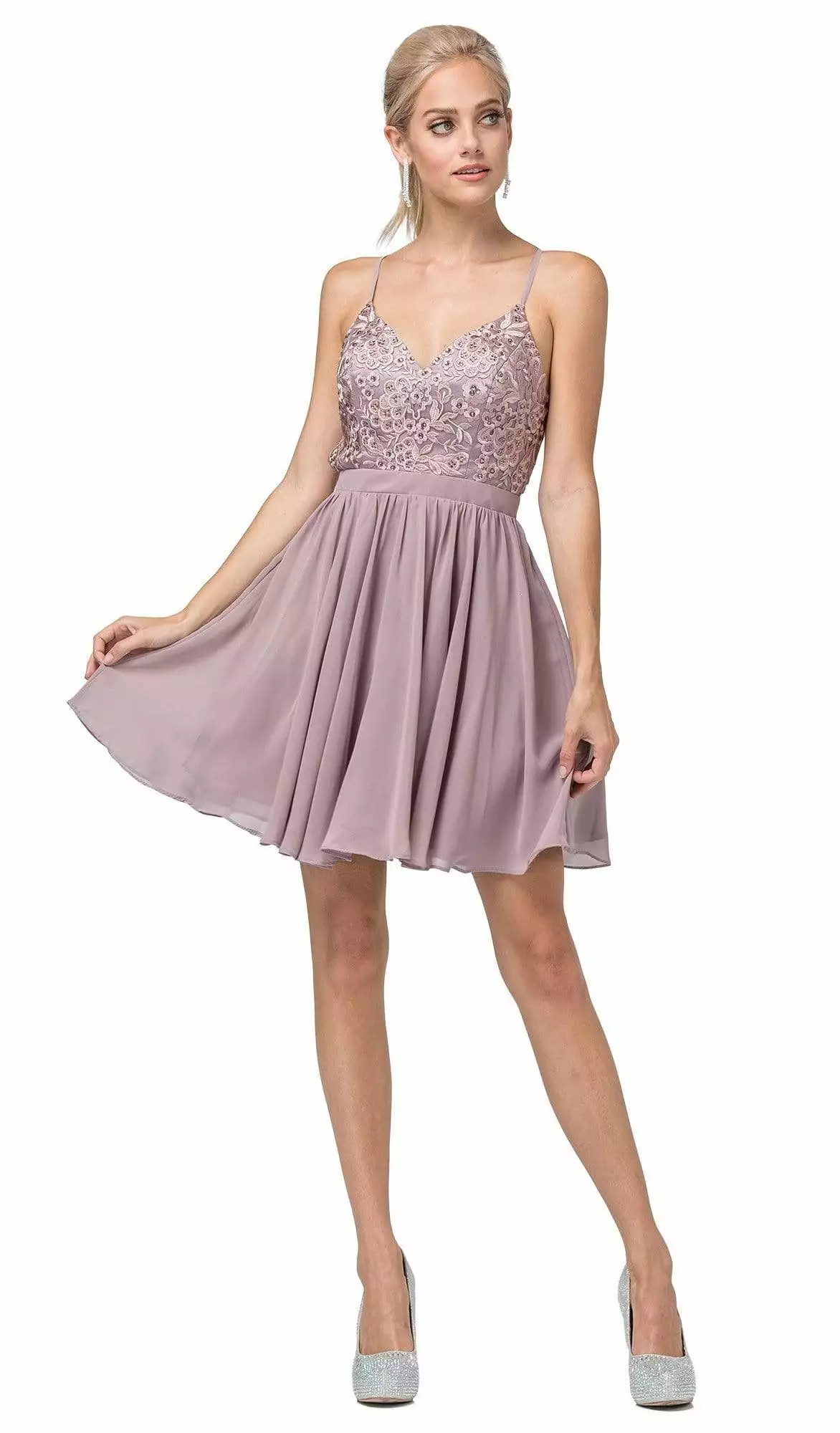 Get ready for everyone to stop and stare when you show up in this Dancing Queen 3089 look. Fashions a sleeveless, V-neckline with embroidered bodice supported with spaghetti straps. The fitted bodice flaunts an open back and has a zipper closure. The waist is wrapped in a band and flourishes a mid-thigh A-line skirt. This Dancing Queen dress is perfect on your next formal event!