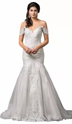 Every bride dreams of this beautiful gown from Dancing Queen 100. Designed in beaded embroideries, the fitted bodice features a V neckline supported by spaghetti and draped off-shoulder straps creating cold shoulder cutout. Fabulous pleats adorn the trumpet skirt as it elegantly flares to the floor completed with a cathedral train. This wedding gown from Dancing Queen is absolutely perfect for photos.