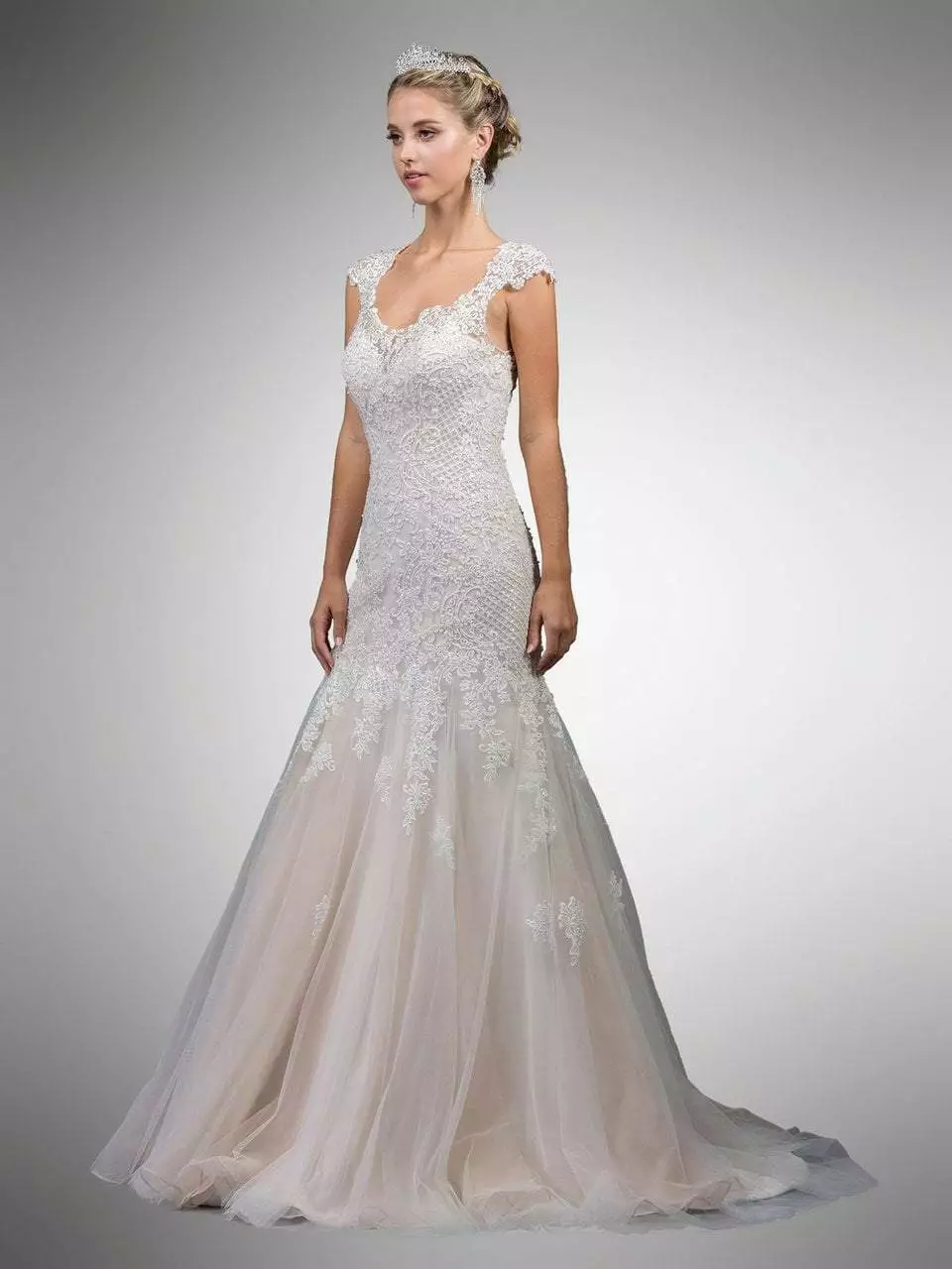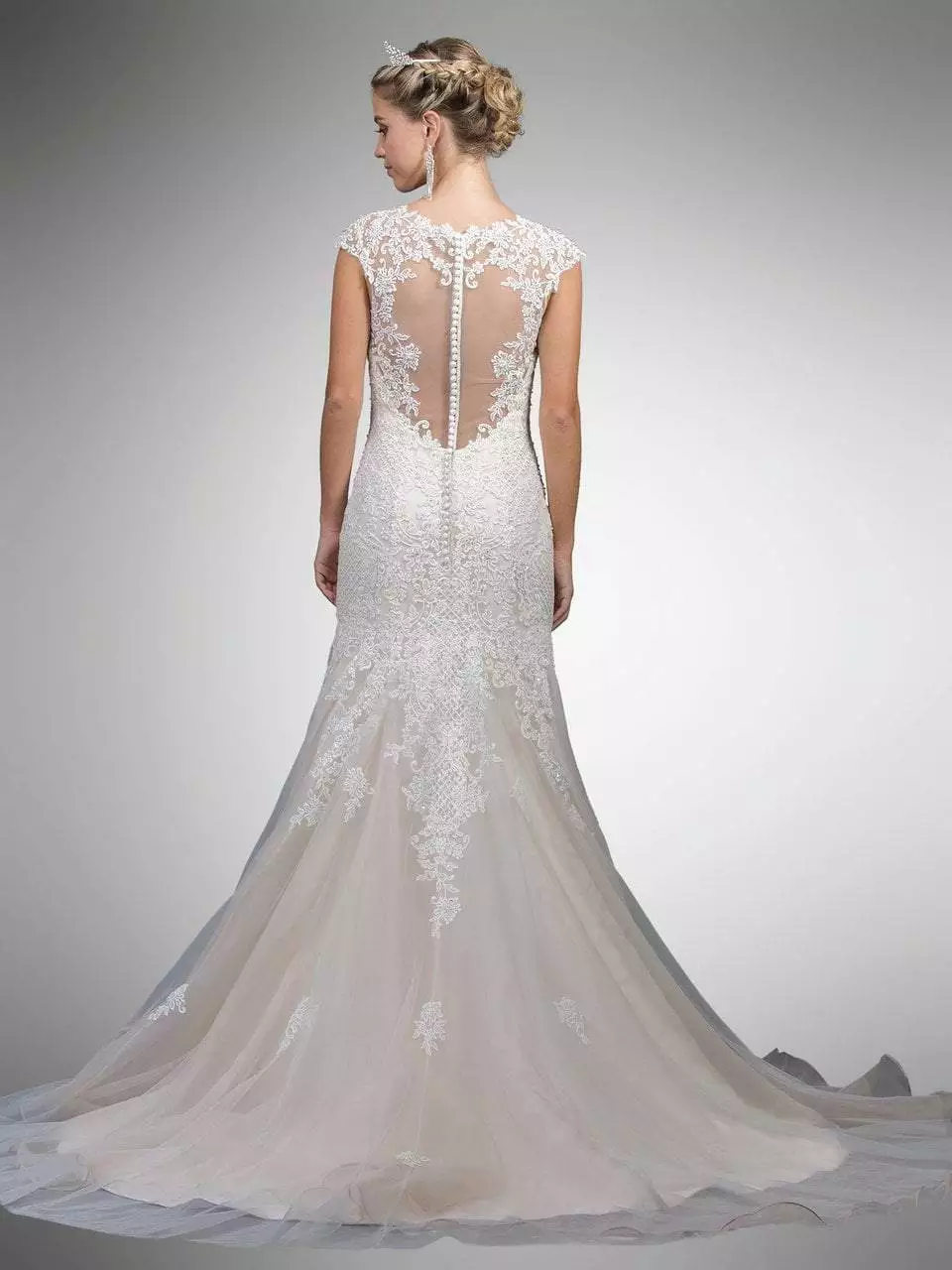 Refined and romantic in textured lace, Dancing Queen 0011 wedding dress offers classic appeal in a figure-flattering fit and flare silhouette. Elegant blend of textured lace over delicate sheer fabric, this gorgeous gown features a cap sleeved, fitted bodice with a sculpted scoop neckline. The back of the bodice is crafted with illusion accents and lace appliques, beautifully finished with a row of covered buttons that trail down at the center. This figure-flattering look is designed to fit snugly through the bodice and hips before flaring out into a frothy flared skirt with a court length train. This Dancing Queen wedding gown is perfect for the modern bride who wants a beautiful, memorable look for her big day.