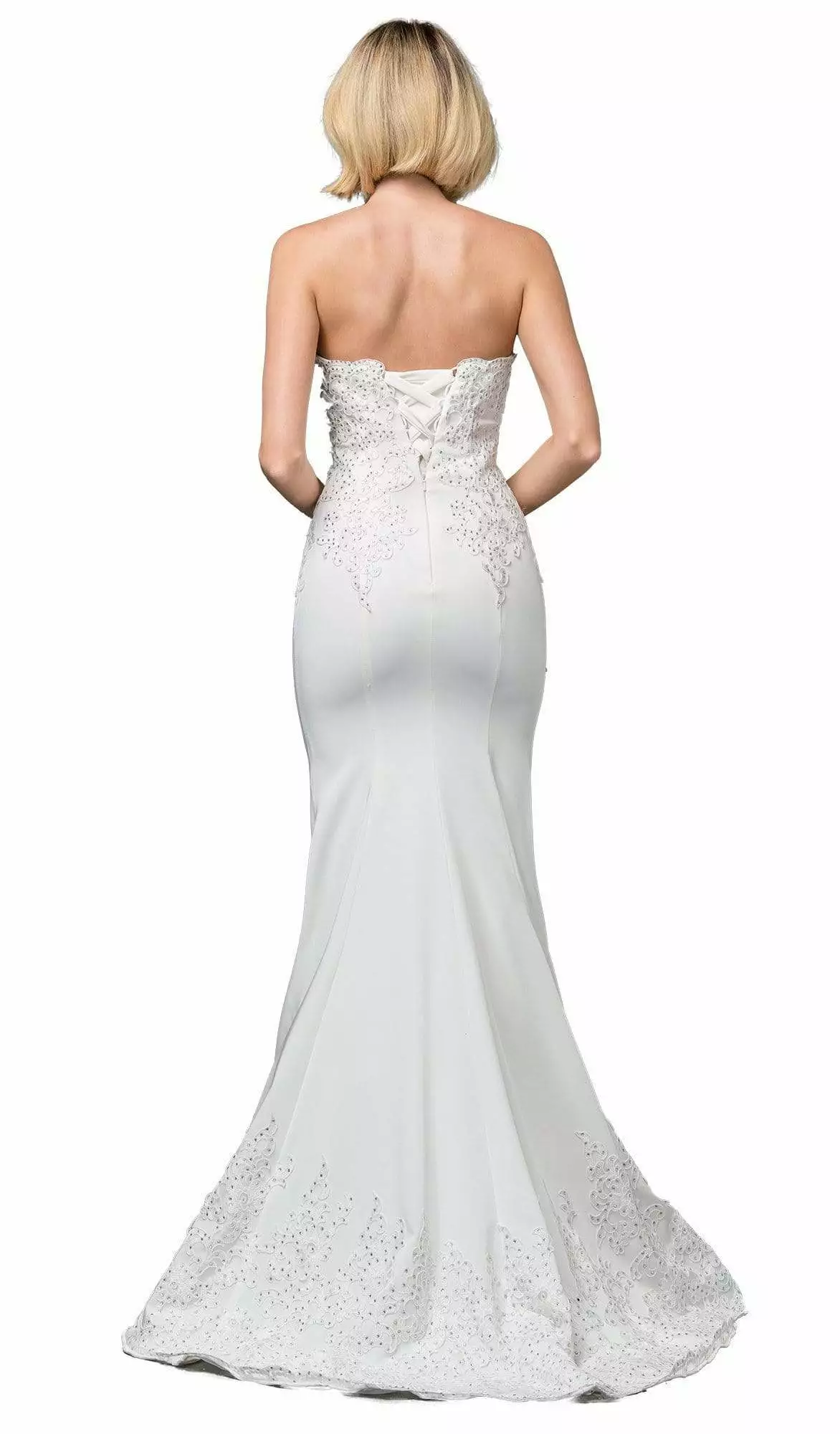 Look like a siren in a melodic gown from Dancing Queen 136. Appeals in a strapless, deep sweetheart neckline with sheer inset at mid-bust. Designed with beautiful embroidery, the dress has a fitted bodice and the skirt forms a trumpet silhouette with a sweep train finish. Infuse your special event with stellar style in this Dancing Queen gown.