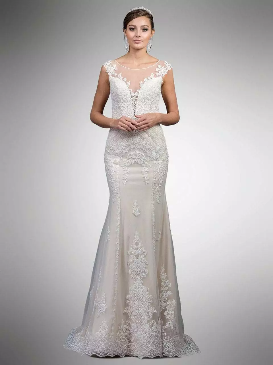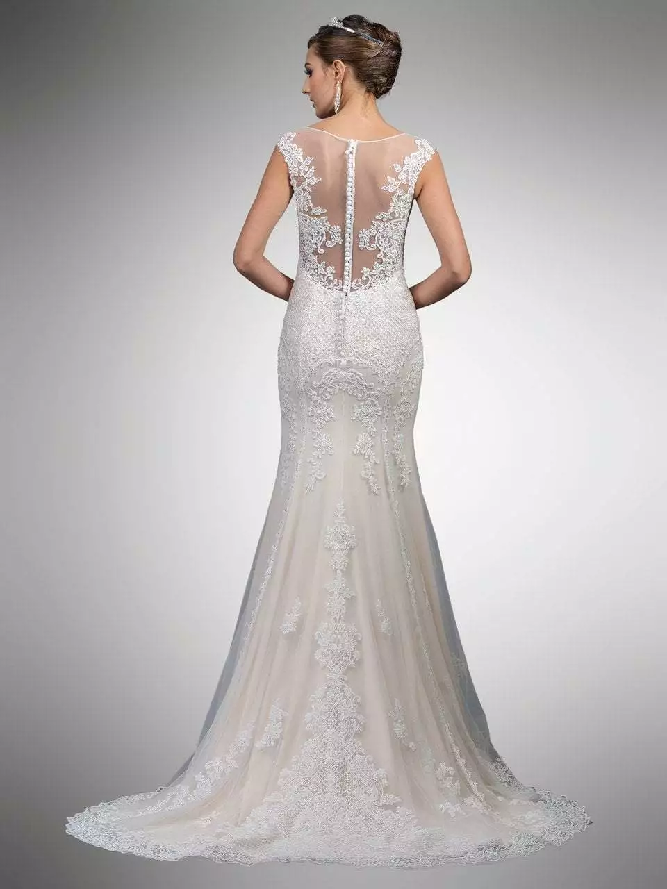 | Details: | Sheer fabric, Sweetheart lining, Floral lace, Cap sleeves, Fitted bodice, Trumpet skirt, Buttons, Trumpet skirt |