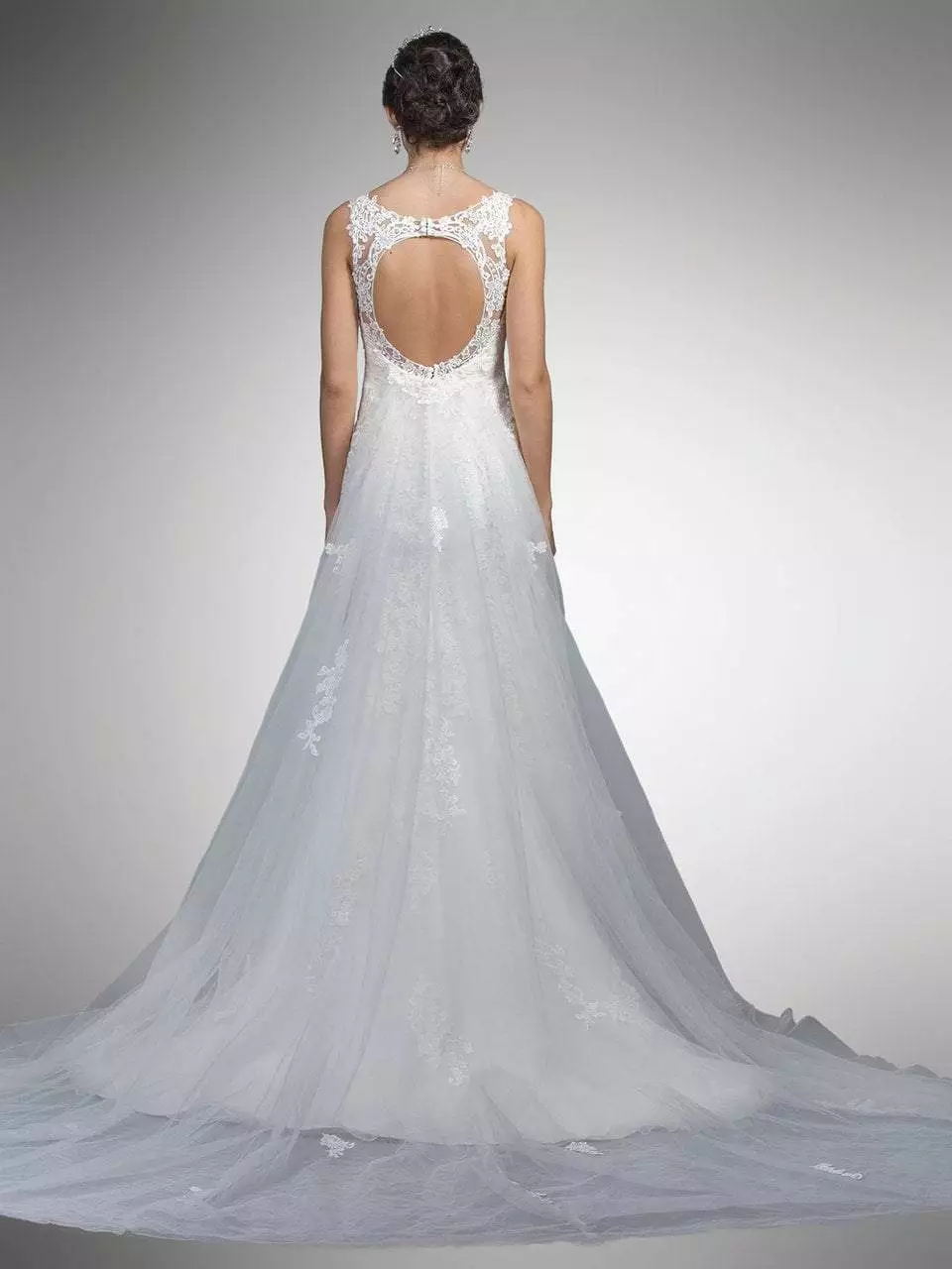 | Details: | Sleeveless, Foliage Appliques, Rhinestones, Illusion Cutout Back, Fabric-Coated Buttons, Sheer Skirt Panel, Court Train |