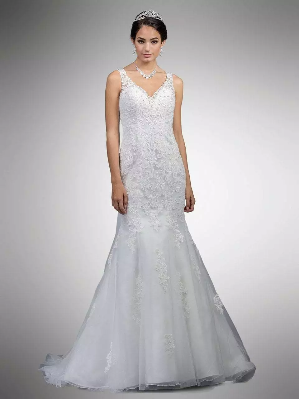 Be the very essence of romance as you glide into his arms wearing this magnificent Dancing Queen 0034 creation. Brilliantly embellished with a mesmerizing display of foliage lace appliques, this immaculate piece shows off a v-neckline accented with tapering sheer shoulder straps. Designed with a beautifully adorned illusion cutout trimmed with fabric-coated buttons, the trumpet skirt sculpts fabulously along the hips before flaring splendidly down to a full-length hemline. Overlaid with an ethereal panel trailing from the back of the skirt, this sheer spectacle glides down to the floor to an outstanding court train. Look like a refined vision in this unforgettably ornate Dancing Queen masterpiece.