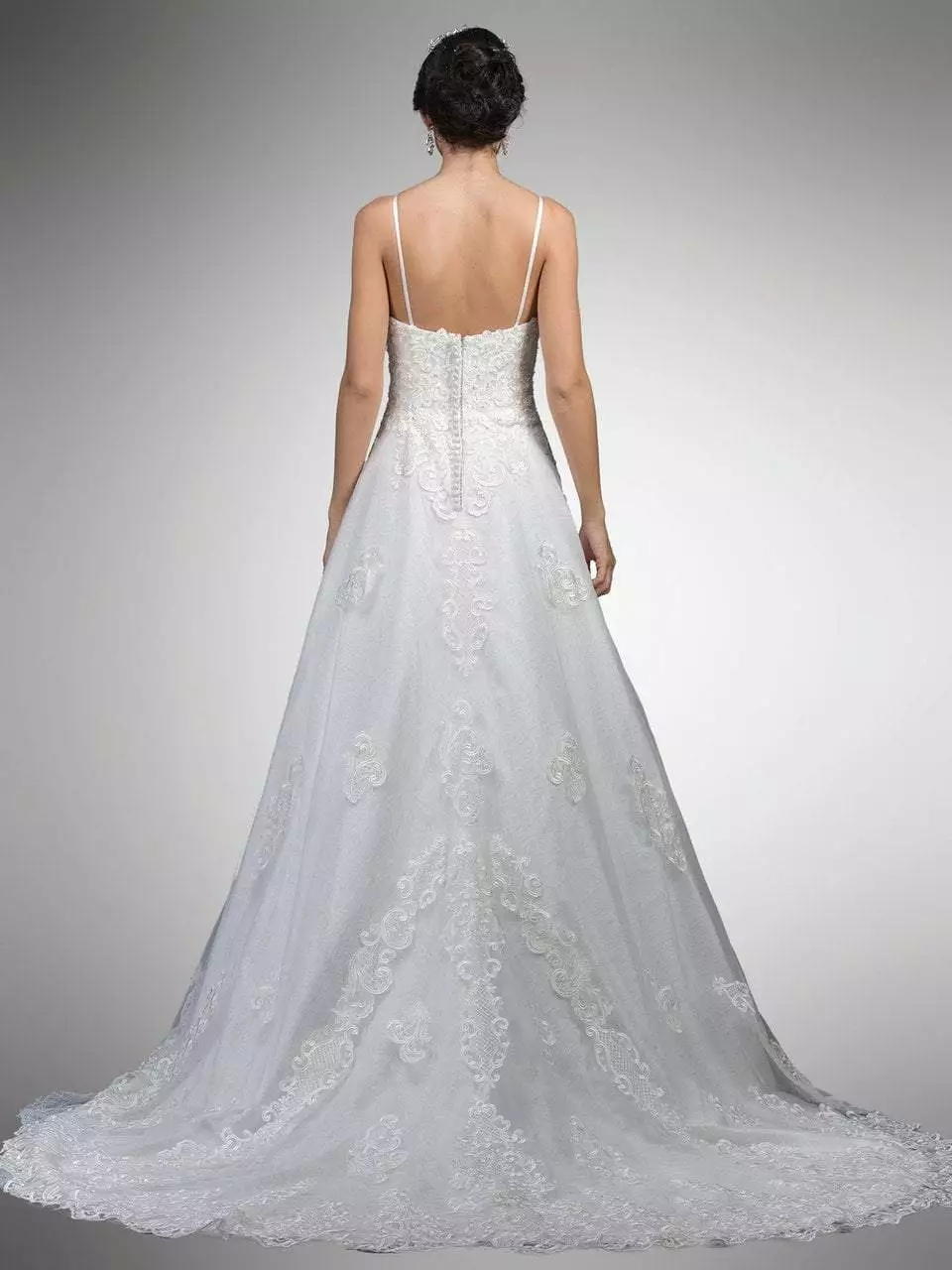 Make yourself into a vision of loveliness in this spectacular bridal gown by Dancing Queen 0041. The curve hugging top features a sweetheart neckline supported with spaghetti straps and lead to the mid-open back. Stunning embroideries accented with heat stones adorn the bodice and bottom of the skirt creating scalloped edges. An elegant sweep train adds the perfect touch to the whole stunner. All eyes will be on you as you walk your grand entrance with this Dancing Queen ensemble.