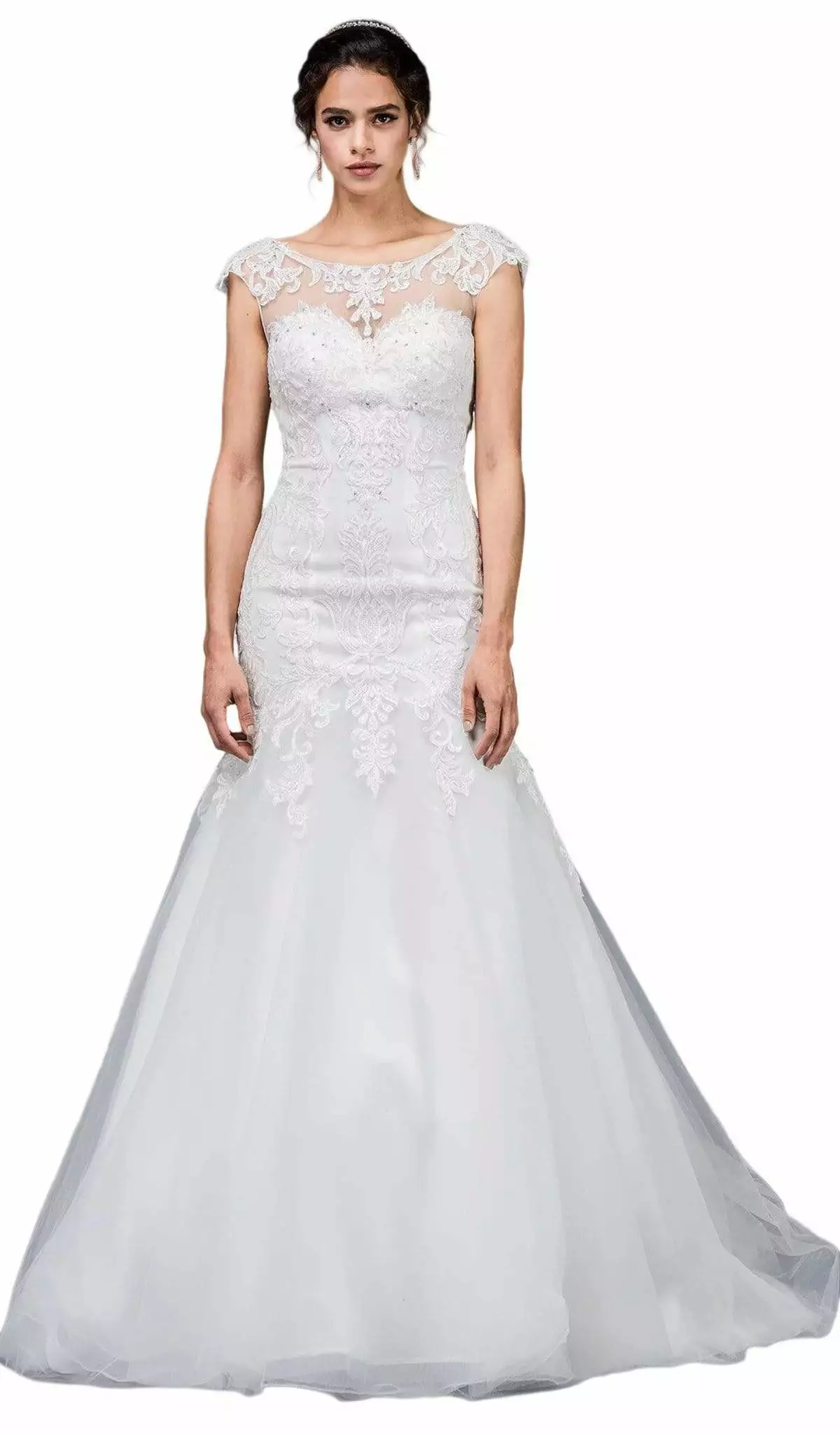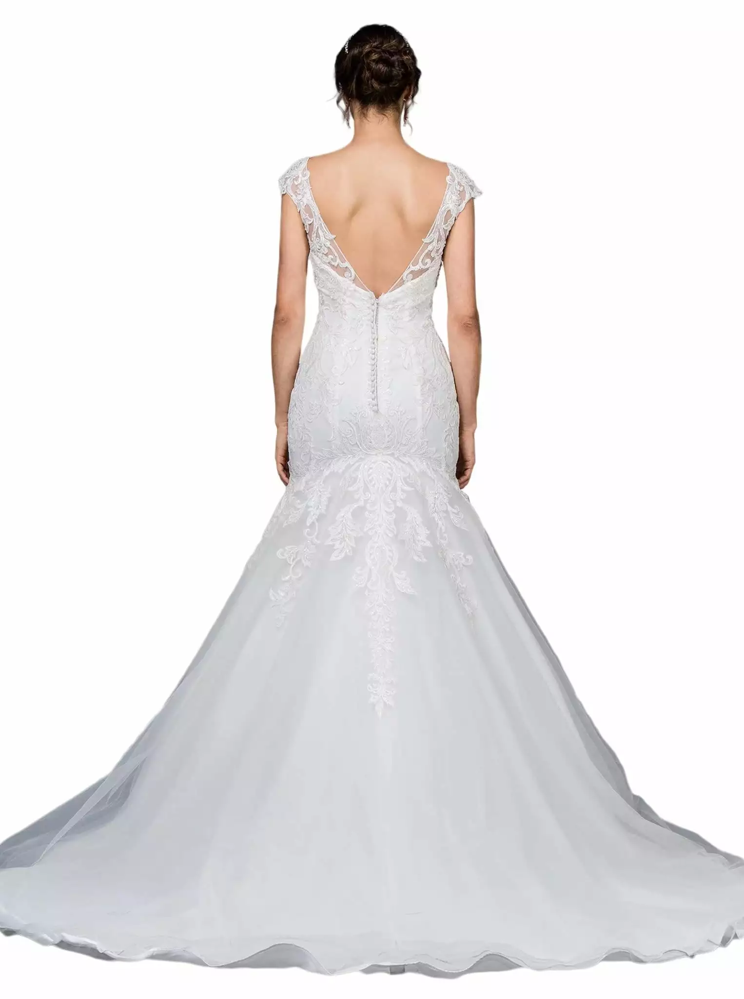 | Details: | Cap sleeves, Lace appliques, Sweetheart lining, Fitted bodice, Trumpet skirt, Low V-back, Covered buttons, Trumpet skirt, Sweep train |