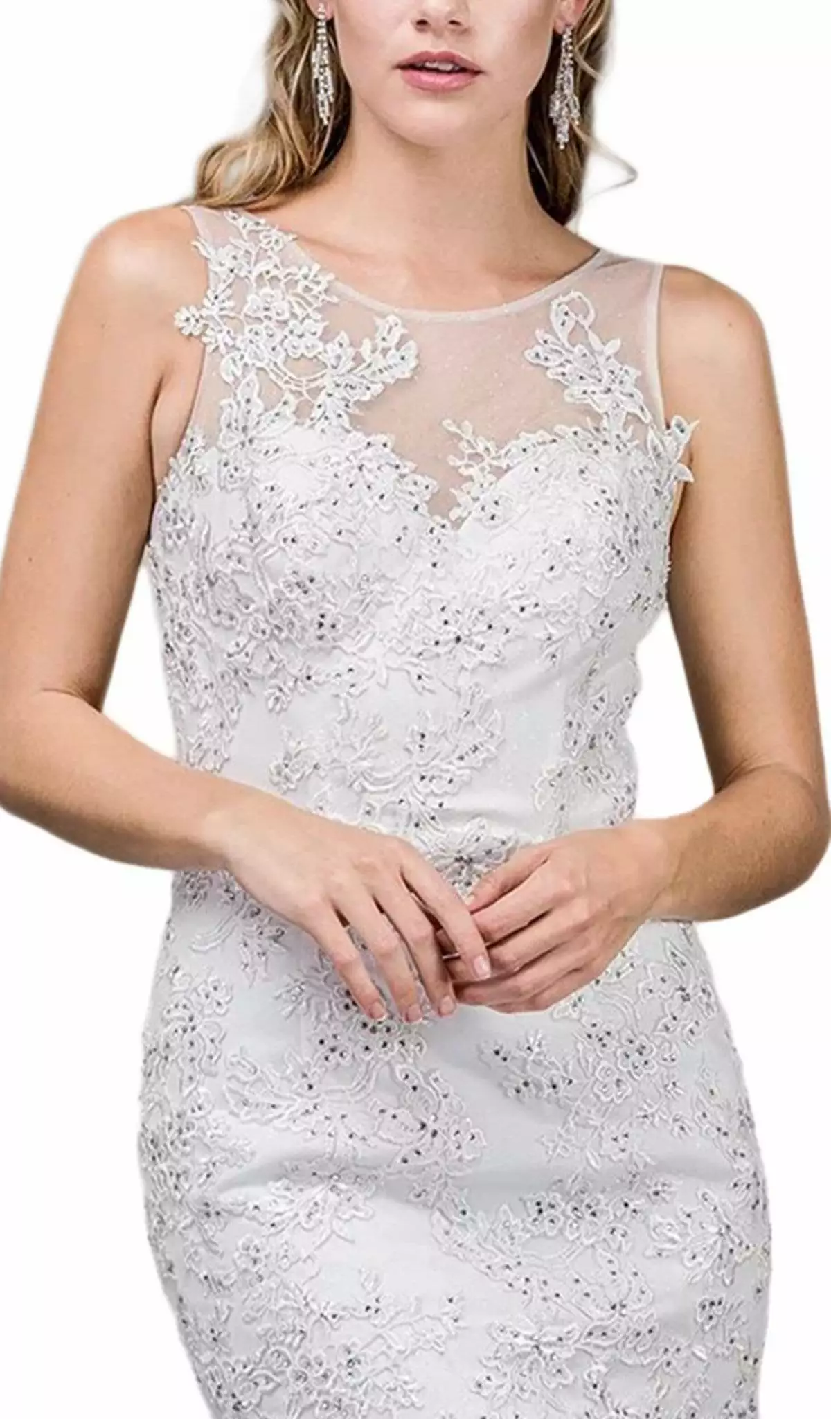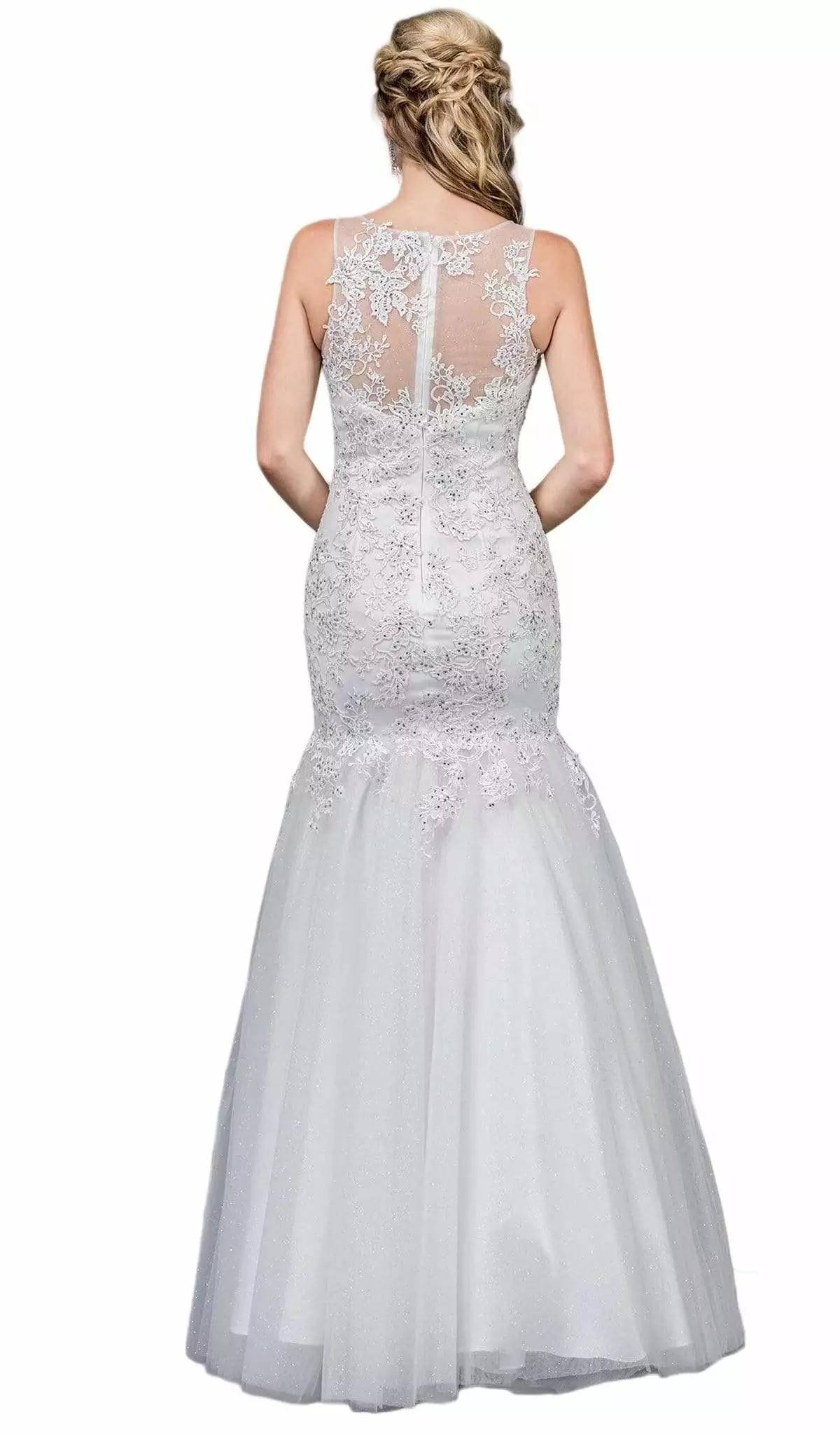 | Details: | Beaded lace, Sleeveless, Sweetheart lining, Sheer fabric, Fitted bodice, Trumpet skirt, Back zipper |