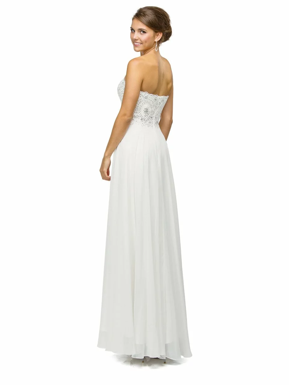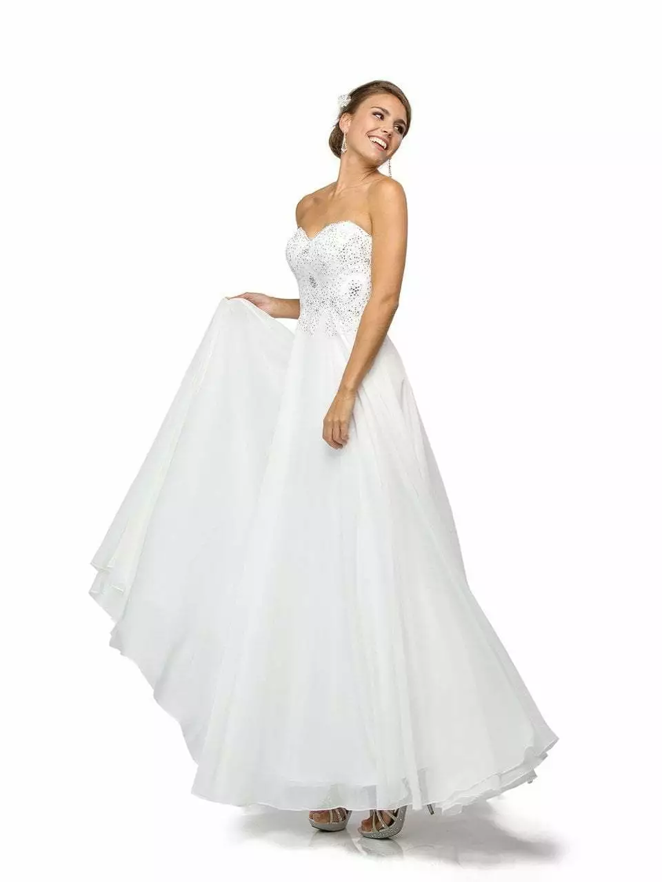This stunning long chiffon ball gown will stand out from the crowd at your next formal occasion. This floor-length sweetheart dress flaunts a fitted bodice and glittery golden beads that flows over the natural waistline atop the layered chiffon floor-length skirt. Removable spaghetti straps let you change the look of this ball gown to create a strapless gown. Make your grand entrance in this breathtaking ball gown.