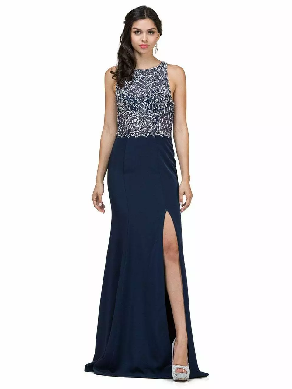 Impress the upscale crowd with your ethereal elegance as you glide into that opulent party in this gorgeous Dancing Queen 9964 creation. Magnificently festooned with iridescent stones set in an elaborate lattice and scroll motif on a gossamer bodice, this exquisite piece flaunts a jewel illusion over a sweetheart neckline and a cutout sheer open back. Scalloped around the natural waist, sculpting seams contours the sheath skirt as it parts with a thigh high slit and rushes down to a stunning full-length hem. Glide into that spectacular event and light up with confidence in this intricate Dancing Queen masterpiece. Model is wearing the Navy and Off-White colors.