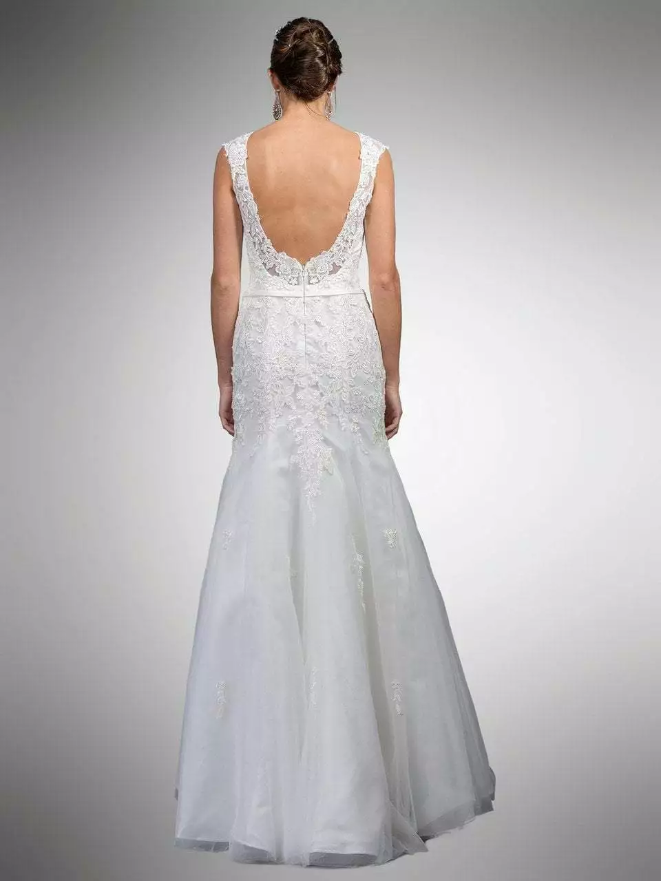 | Details: | Cap sleeves, Sheer fabric, Sweetheart lining, Thin belt, Fitted bodice, Trumpet skirt, Low scoop back, Back zipper |