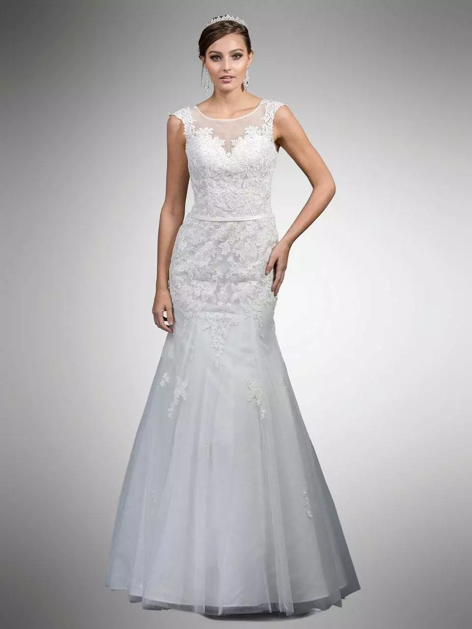 Portray the rich variety in design of this gown by Dancing Queen A7000. This elegant gown features an illusion bateau neckline with cap sleeves. The sweetheart lined bodice is decorated lavishly with lace appliques down the full length trumpet skirt. The back has a low scoop cut and has a zipper closure while the waist is cinched in a thin belt. This Dancing Queen gown definitely parades the elegant and classy style.