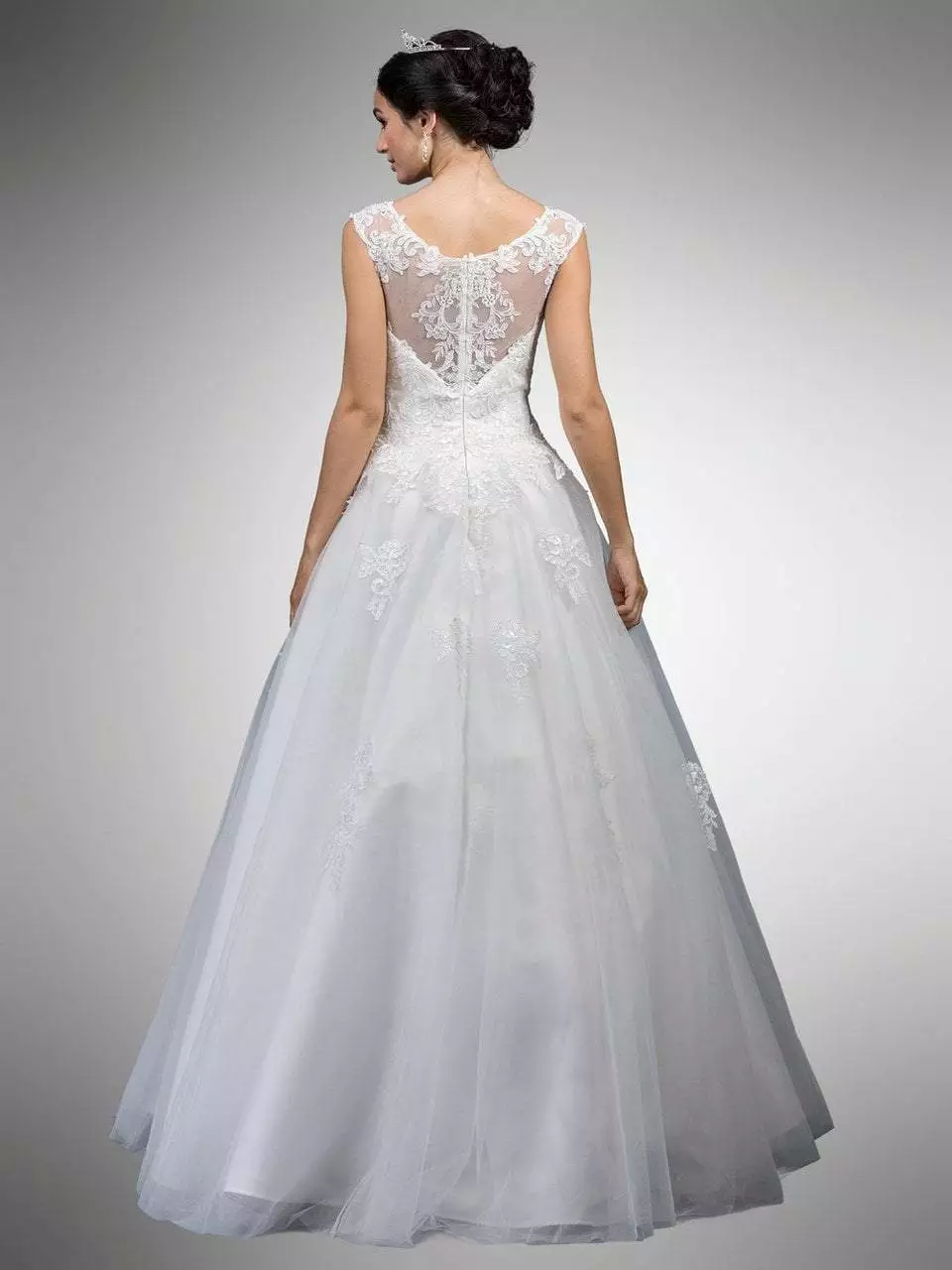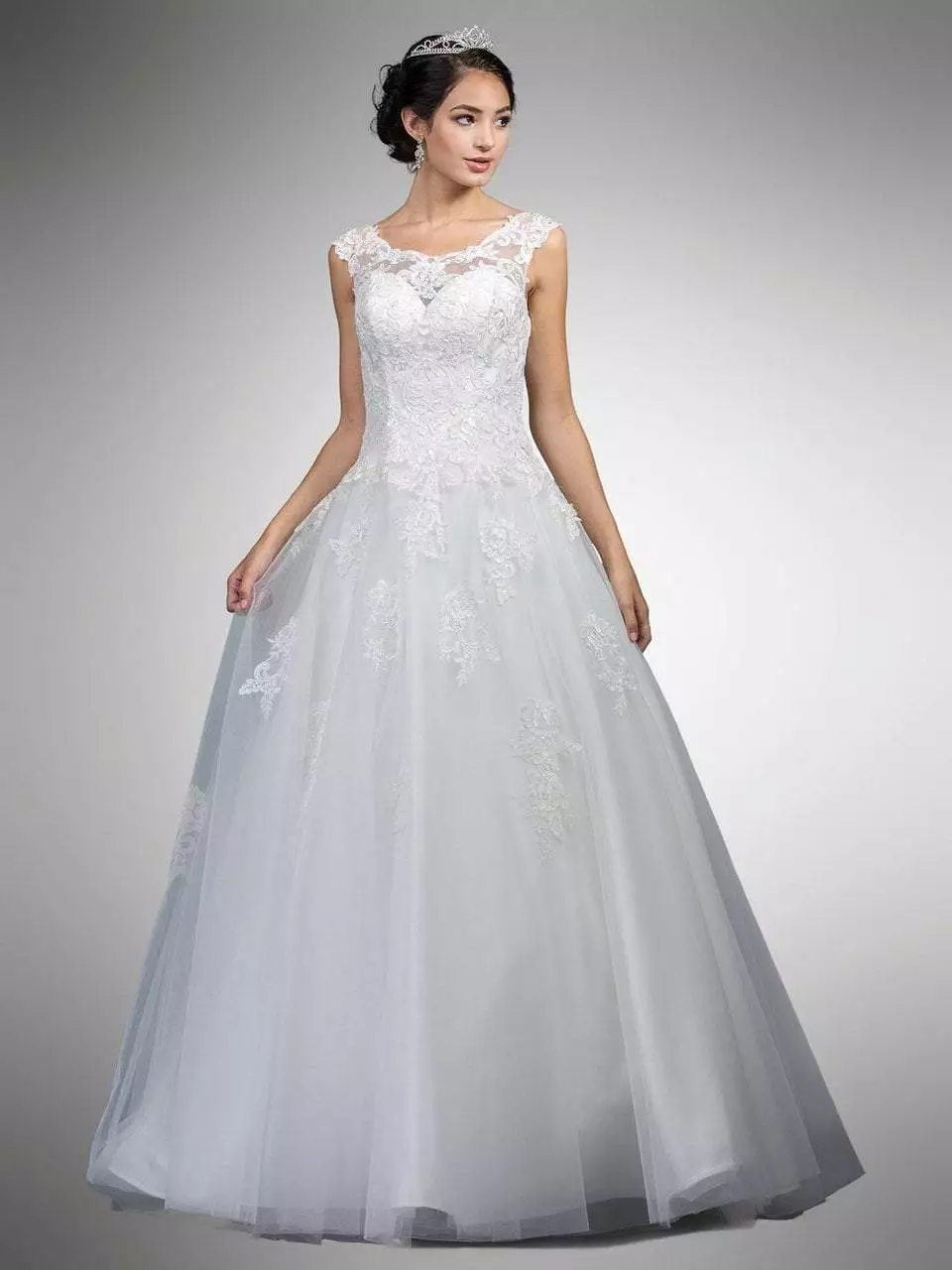 You will be an enchanting beauty in Dancing Queen A7002. Features an illusion bateau neckline with cap sleeves. The sweetheart lined bodice is accented with embellished lace appliques. The back has a zipper closure while the skirt opens in a ballgown silhouette with sheer overlay. You are princess for an evening in this beautiful Dancing Queen design.