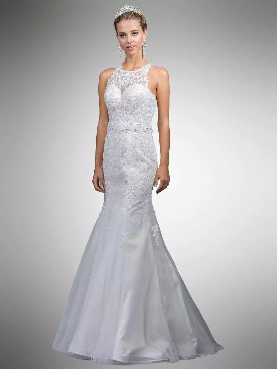 Make it a moment to shine in this Dancing Queen A7003 gown. Glams in a sleeveless, illusion halter neckline with sweetheart lined bodice covered in beaded lace down the mermaid skirt. The sweetheart lined bodice is cinched in a belt and from the natural waist begins its full length skirt that completes the look in a train and sheer overlay. This Dancing Queen gown is a charming choice for your next special occasion.