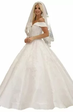 Brandishes an off-shoulder neckline with fitted bodice ornate with embellishments. It has a lace up back and from the waist begins a voluminous ballgown skirt.