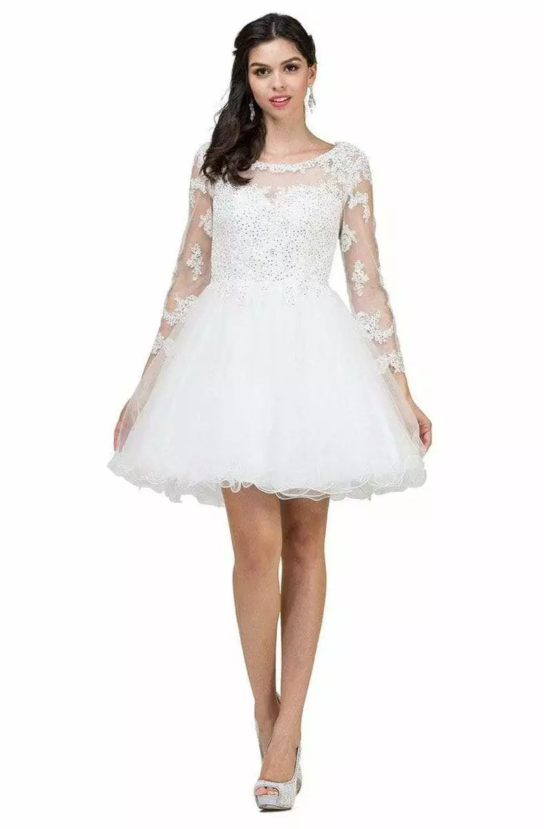 This gown is decorated with lace appliques interspersed with rhinestones, This piece presents a bateau illusion neckline with a sweetheart bodice and sheer quarter sleeves. The ensemble features an illusion full back with a back-zipper closure. The layered A-line skirt flares to a rolled short hemline.