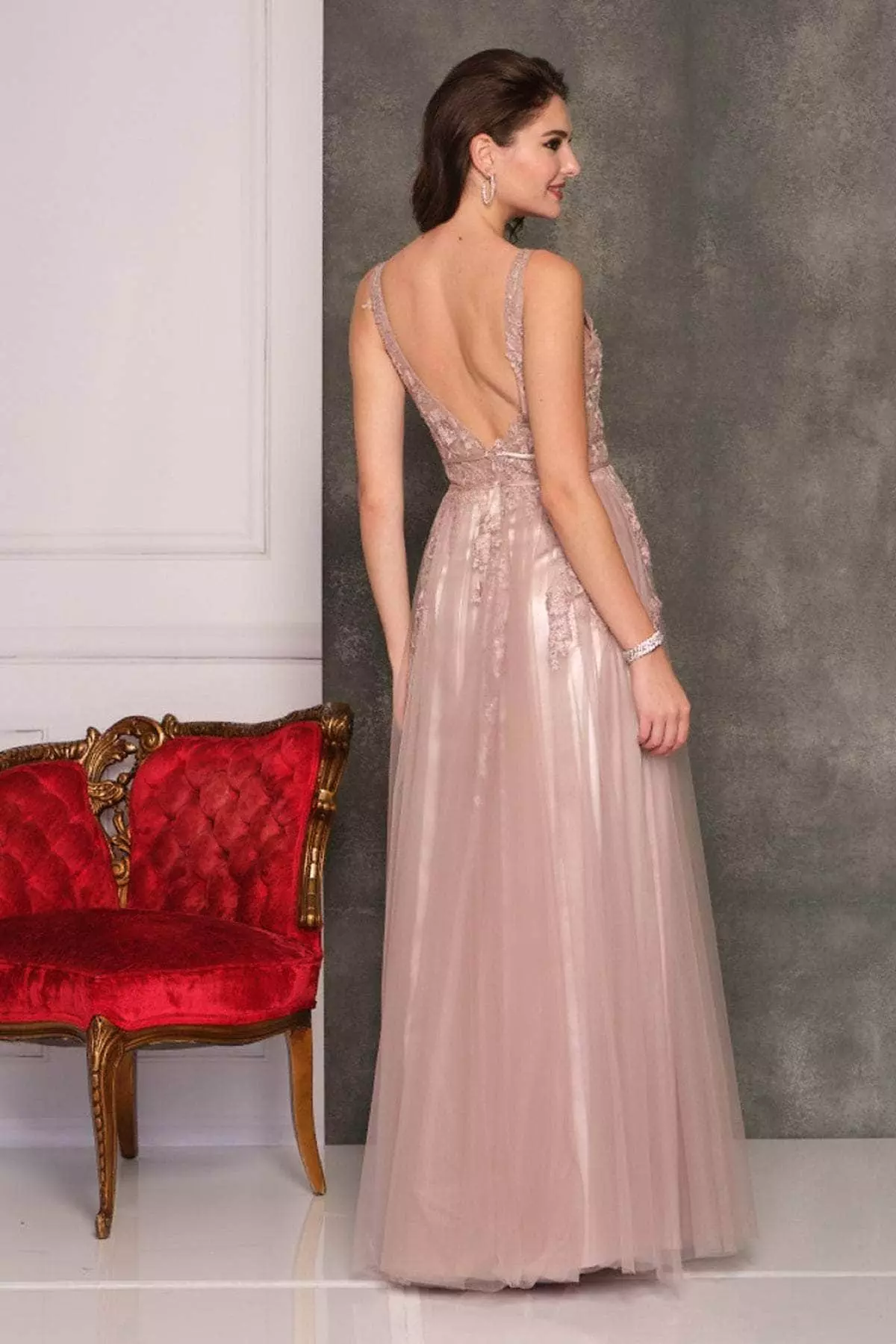 | Details: | Sleeveless, Sheer Bodice, Embroidered Appliques, V-Open Back, Stringed Waist, Full Length Hem |