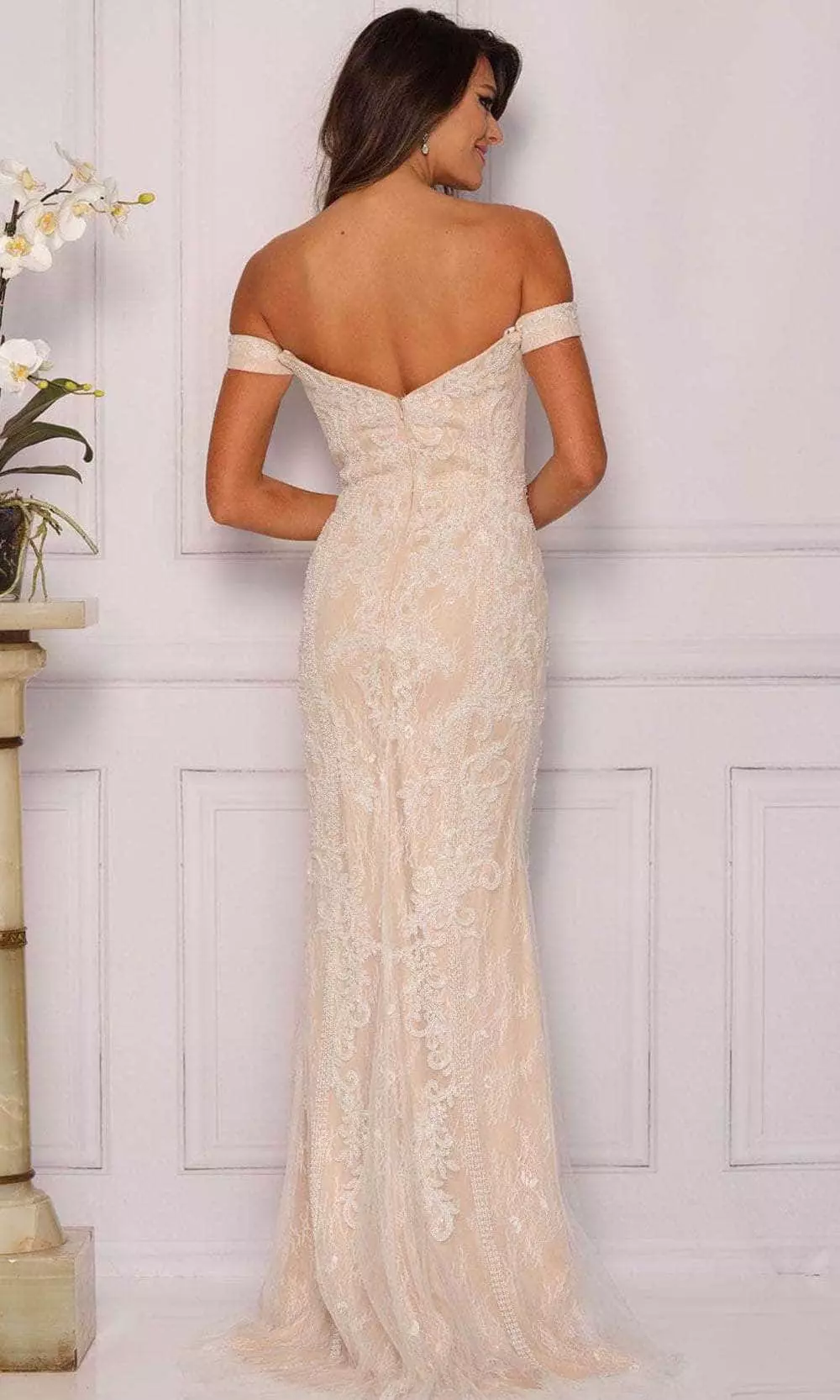 Fantasize an occasion of eloquent style and poise at your big day while wearing this charming Dave & Johnny A10321 masterpiece. Elegant lace emrboideries and complementing lining adorn a fitted silhouette in this sumptuous style. Flaunting an off the shoulder, sweetheart neckline over a fitted bodice. Open back design and a sheath skirt finish off the outfit with a sweep train at the back. Look flawlessly beautiful in this lovely wedding dress from Dave & Johnny masterpiece. Model is wearing the Ivory color.