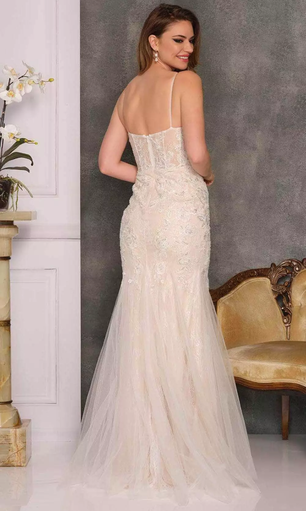 | Details: | Sleeveless, Tulle, Lace, Embroidery, Concealed Back Zipper, Open Back, Train |