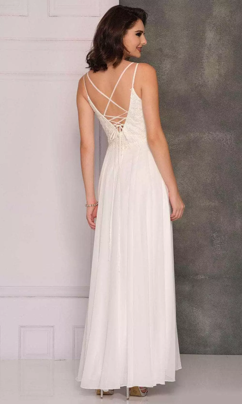 This wedding dress by Dave & Johnny A10550 evokes the spirit of timeless romance that so many modern brides desire for their wedding day. Features an embroidered lace on a frosted floral pattern, the bodice flaunts a deep V-neckline supported by thin straps that lead to a strappy back in an open style. The skirt flourishes in an A-line silhouette, with a concealed zipper closure at the back, which is classic and stylish, as it cascades to a full length hem. Make their jaws drop when you walk down the aisle in this Dave & Johnny Bridal creation. Model is wearing the Ivory color.