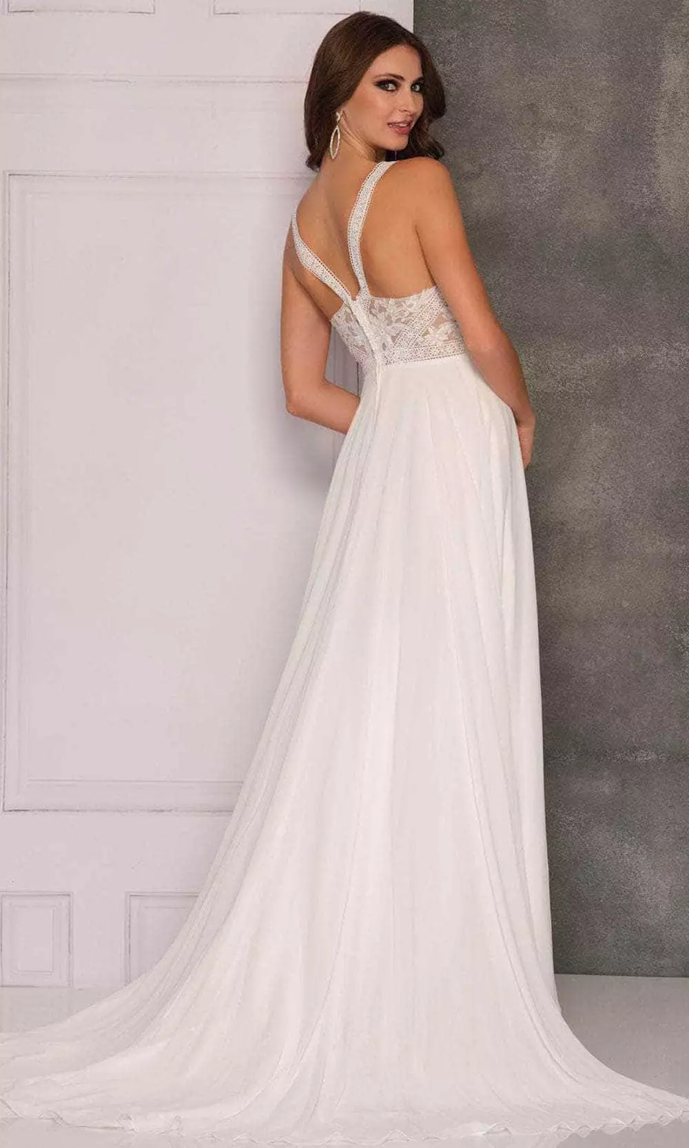 Draw everyone’s attention when you walk down the red carpet in this Dave & Johnny A10583 creation. The figure-flattering design has been entirely adorned with hand-sewn exquisite lace embroidery, which ensures a flawless style. Featuring a laced bodice that gives you an alluring sheer style as it flaunts a V-neckline and padded bra for your comfort. The back is midrised and is secured with a zipper for a secure fit. The skirt flows luxuriously in chiffon fabric, fully lined, as it cascades to a sweep train finish. You’ll be the talk of the event as you wear this Dave & Johnny masterpiece on your big day! Model is wearing the Ivory color.