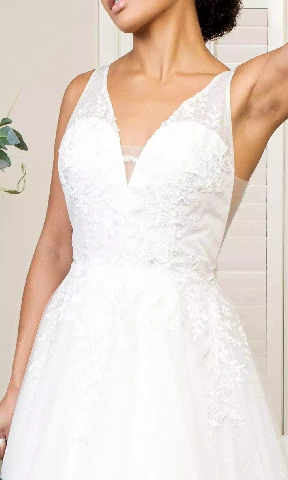 Walk into the church and simply glow in this Elizabeth K GL1906 creation. Festooned with floral embroidery and appliques, this bridal dress charms with a plunging v-neckline with a sheer inset. This stunner features a sheer v-open back and a zipper closure. The frothy skirt cascades into an A-line silhouette with a train. Embrace the elegance of this gorgeous wedding gown by Elizabeth K.