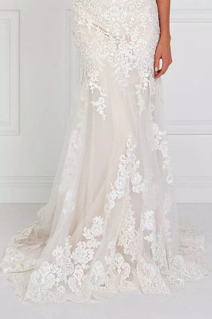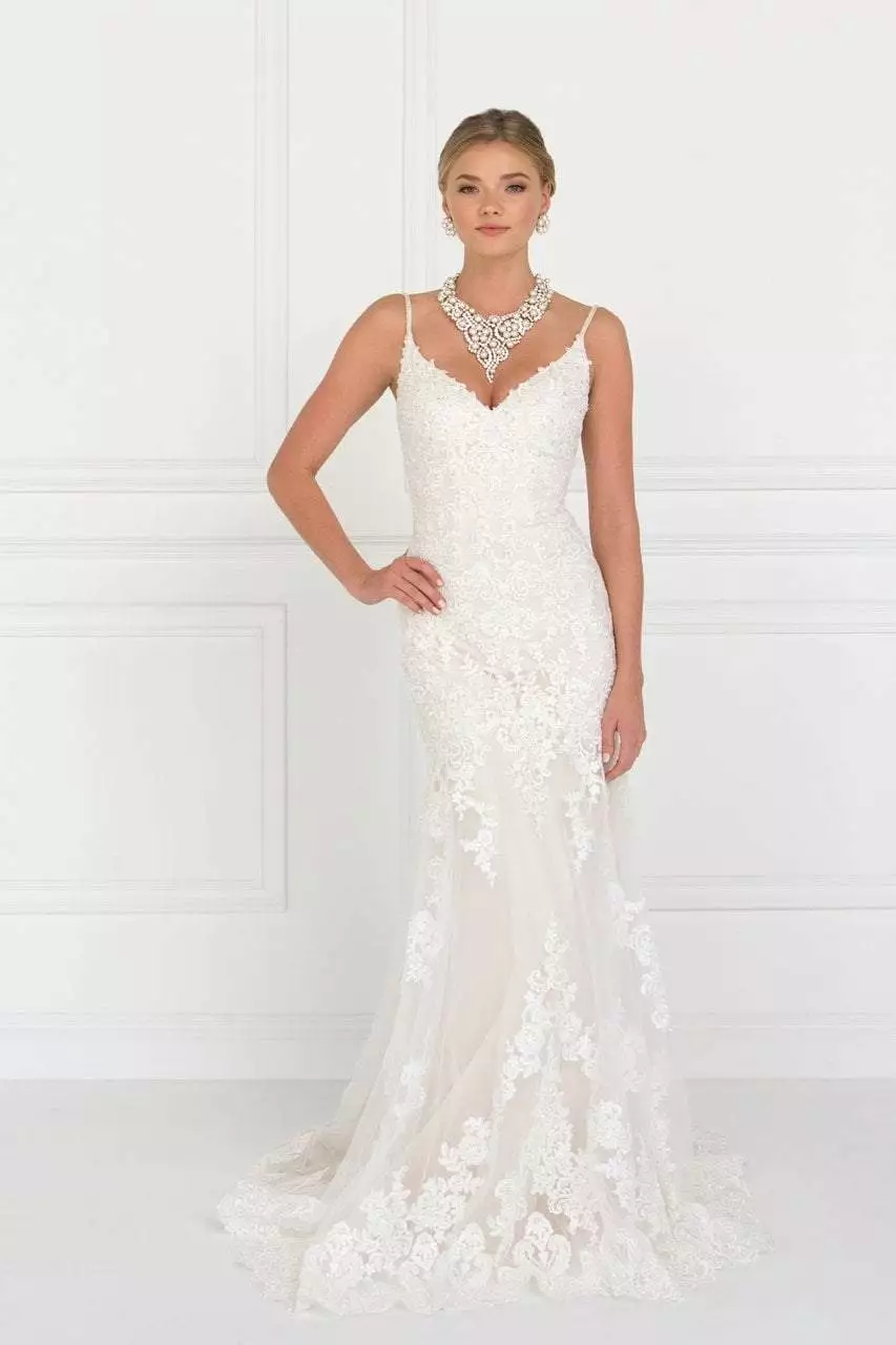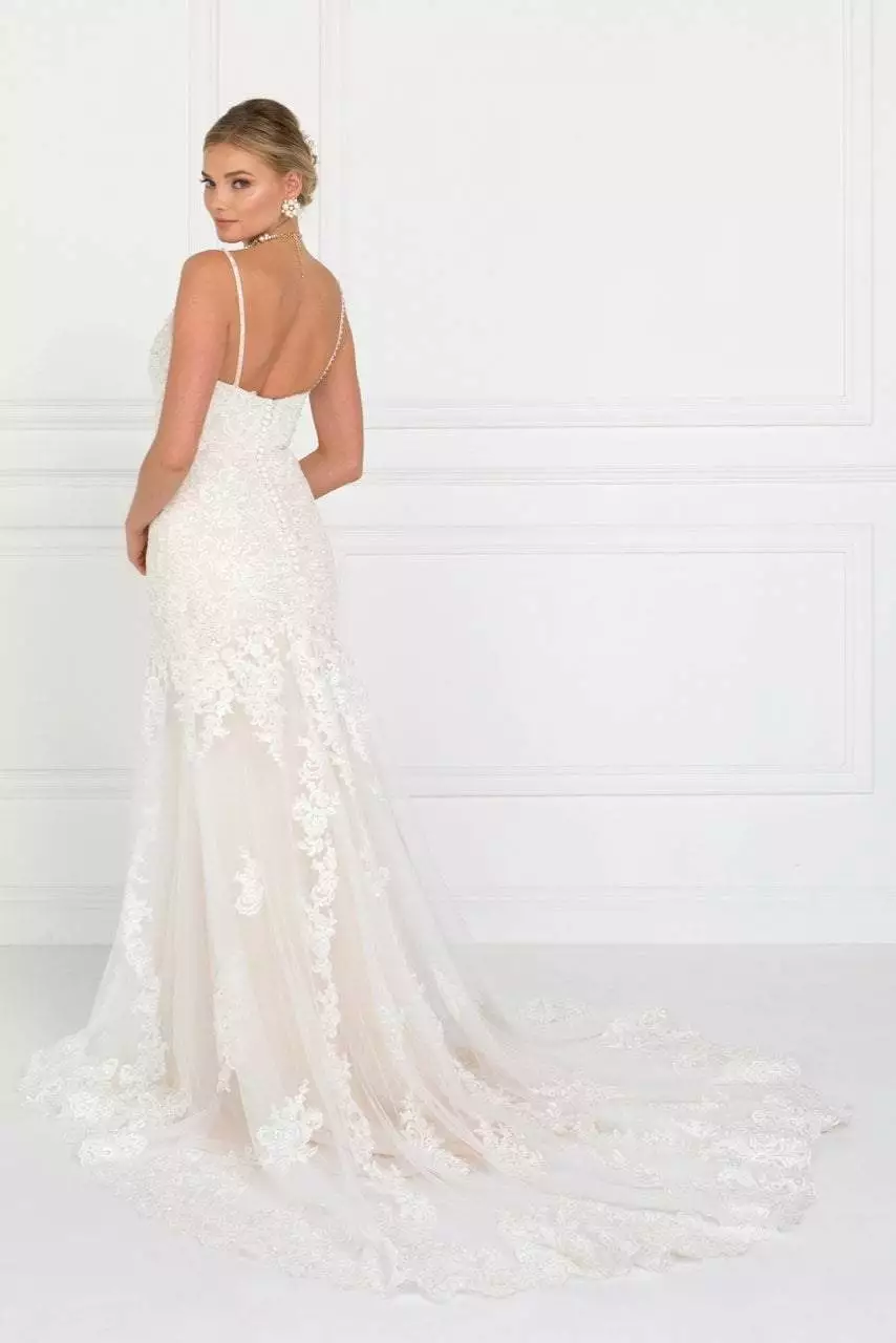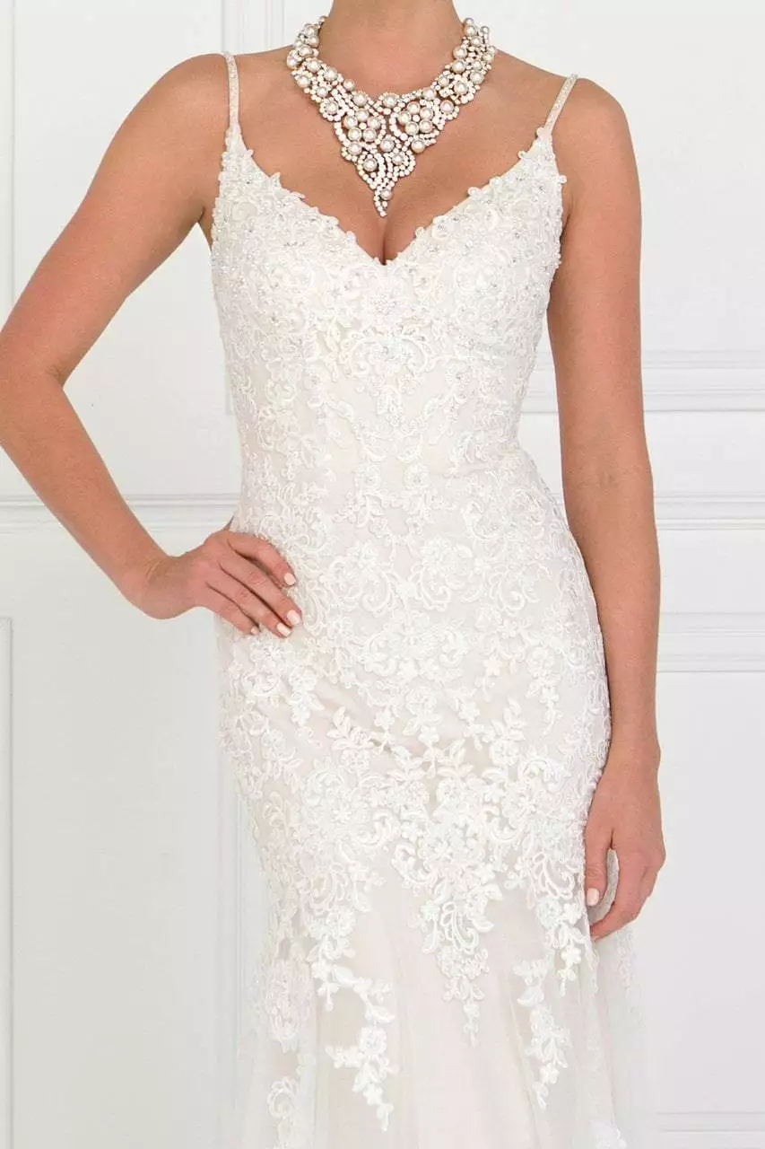 Mesmerize everyone as you walk down the aisle in this stunning gown by Elizabeth K GL1515. Features a sleeveless, V-neckline with bodice supported with spaghetti straps. The entire gown is decorated with beaded lace down the full length trumpet skirt and sweep train. The fitted bodice shows a mid-open back with a zipper closure and button accents. Shimmer and shine in an ethereal gown from Elizabeth K.