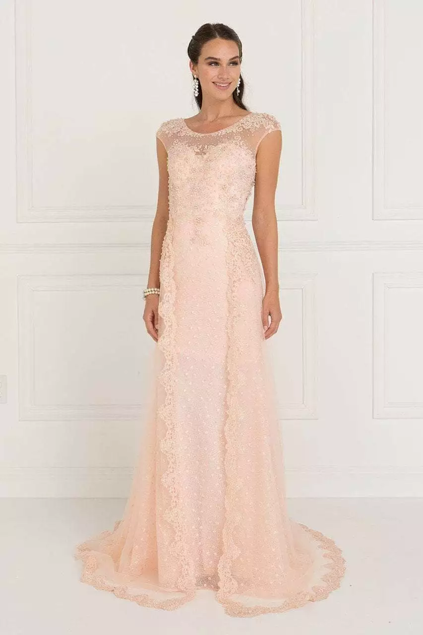 Surround yourself with sparkle of glamour when you walk in this dazzling Elizabeth K GL1539. Graces in an illusion jewel neckline with cap sleeves, the sweetheart lined bodice is richly adorned with lace and embellishments. The back has a zipper closure. A tulle overlay accents the full length sheath skirt and finishes in a sweep train. This Elizabeth K dress is a brilliant look for anyone who wants to stand out at the party.