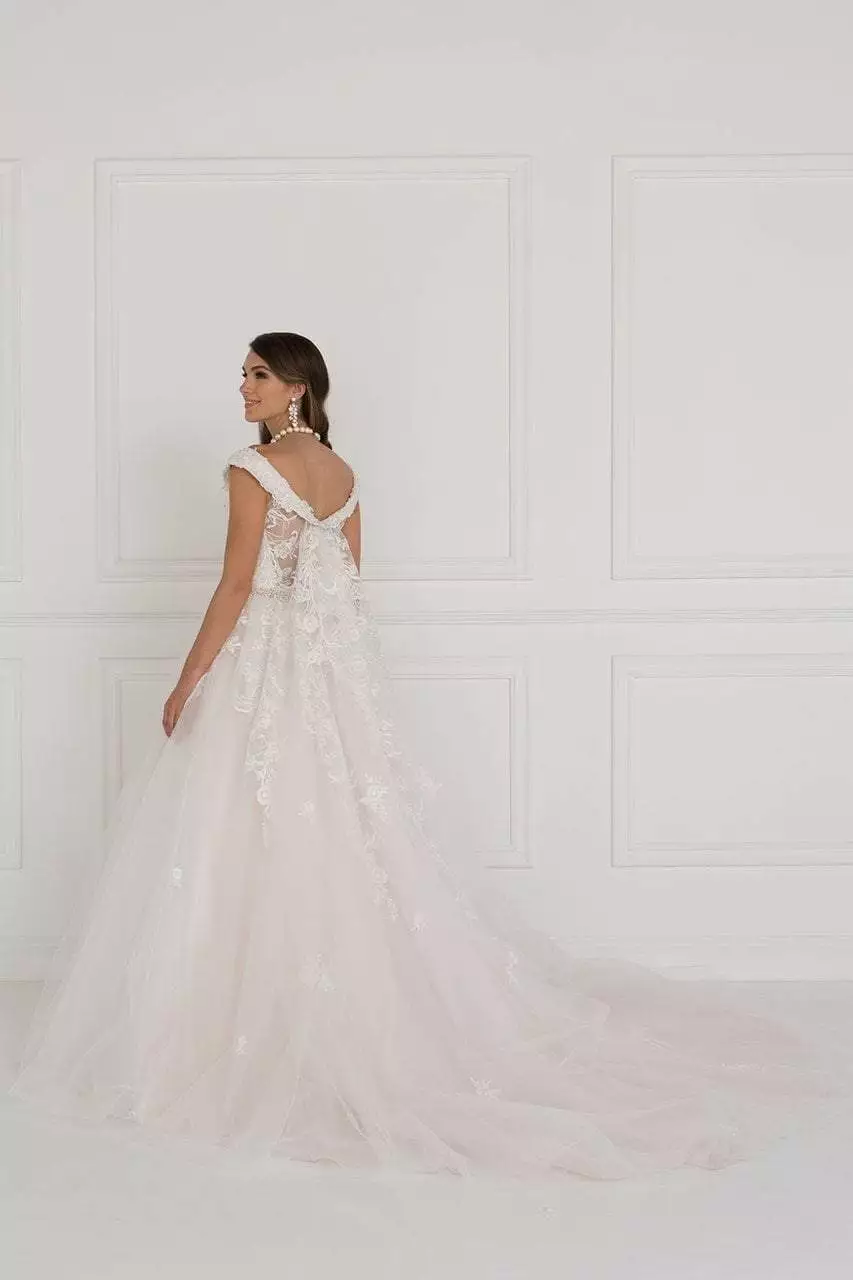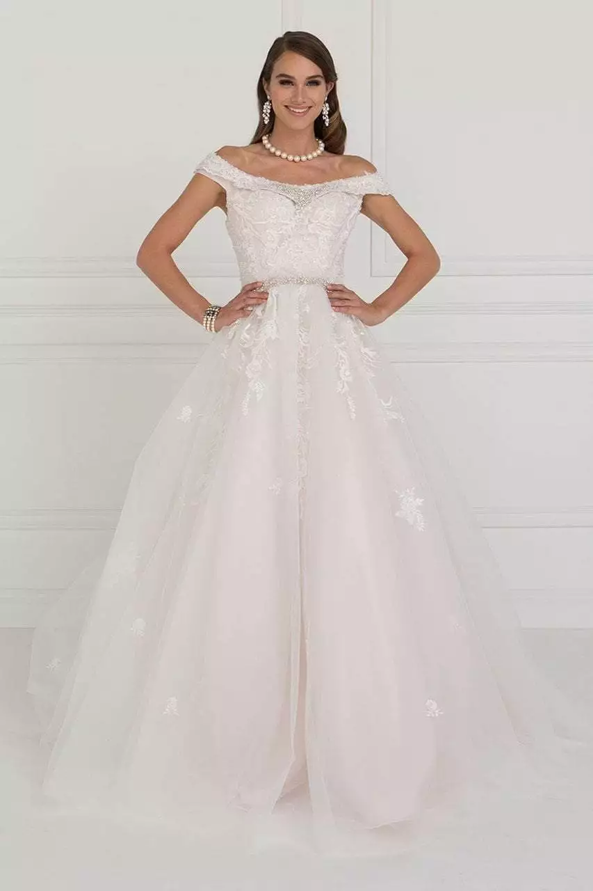 Enter the spectacular ballroom and instantly win over the crowd in this ethereal Elizabeth K GL1589 creation. Beautifully fashioned from a floral lace fabric dotted with refined jewels, this beauty reveals an off-shoulder neckline that alluringly blends with an illusion mid-open back. Designed with a lush trailing back panel that streams to create a gossamer chapel train, this fabulous piece cascades a voluminous flare from an iridescent bejeweled band that flows to meet the floor in a luxurious full-length hem. Impress everyone with your sheer presence in this amazingly opulent Elizabeth K masterpiece.