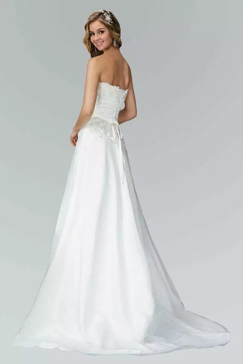 Have all eyes on you in this splendidly crafted masterpiece by Elizabeth K GL2077. A strapless semi-sweetheart neckline crowns the fitted bodice stunningly fashioned with bead embellishments. Shirring highlights the natural waist and leads to the A-line skirt that tapers to a full length hemline. A lace up closure secures the mid-open back, providing an adjustable fit. A lovely sweep train adds dramatic touch to the whole ensemble. Make it a night to reminisce with this Elizabeth K stunner.