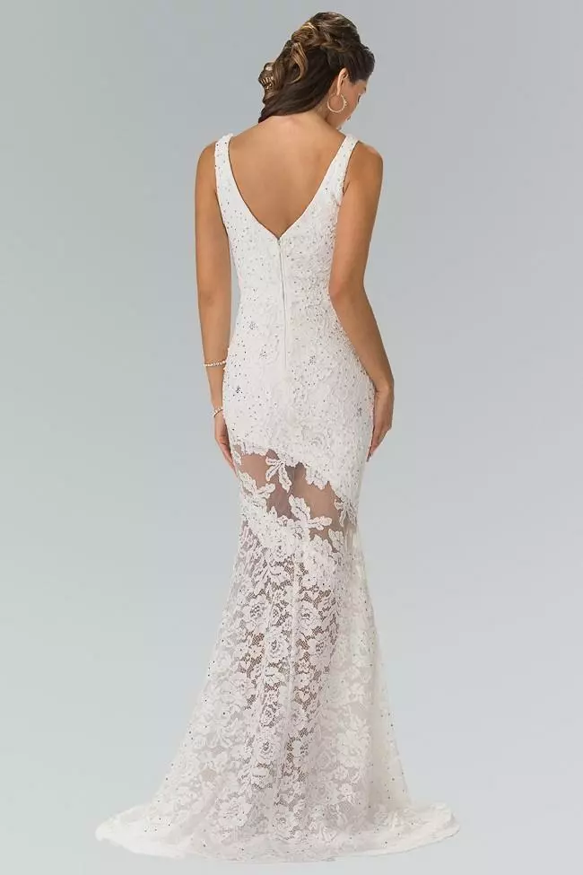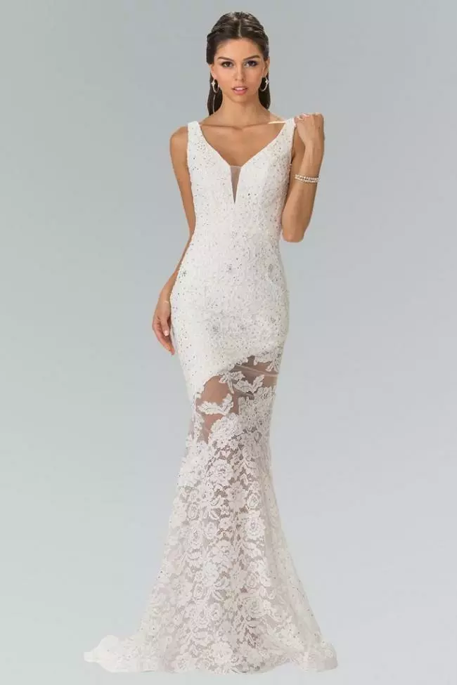 If you are looking for that figure flattering dress, this dreamy lace Elizabeth K GL2249 gown is to die for. Features an illusion v neck and an asymmetrical design that give a modern feel to a traditional style. Zips in the back. This Elizabeth K dress is personalized to fit your curves.