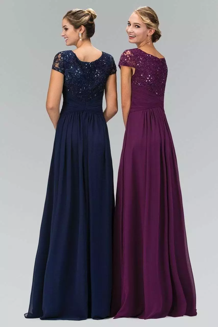 Show off your feminine side with this design by Elizabeth K GL1398. Showcases cap sleeve with scoop neckline. The bodice is richly decorated in lace appliques and beading. The waist is gathered in a ruched waistband and begins its flowy A-line skirt. Wear this Elizabeth K dress for a picture of sophistication. Models are wearing the Navy (Blue) and Eggplant (Purple) colors.???›?�??