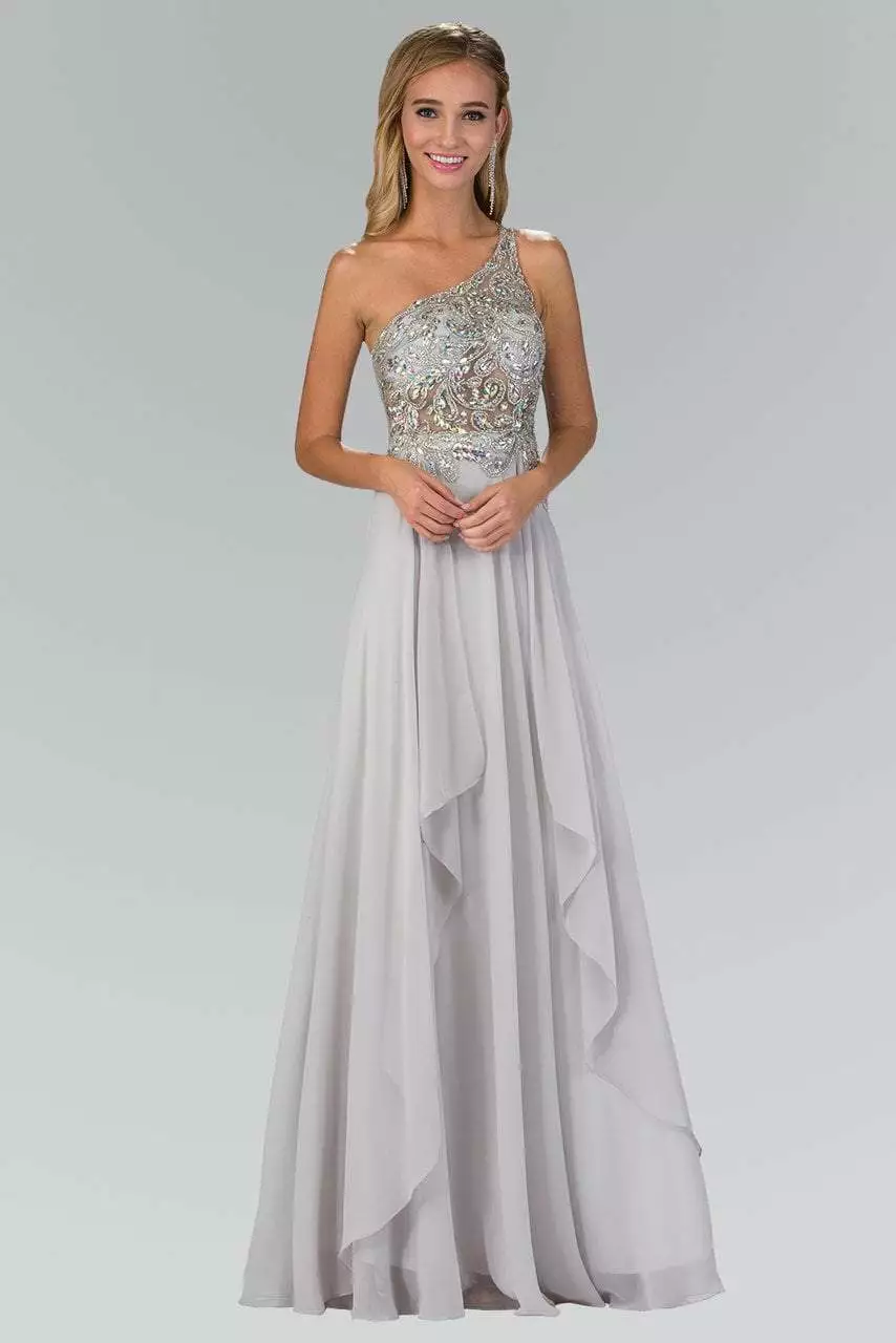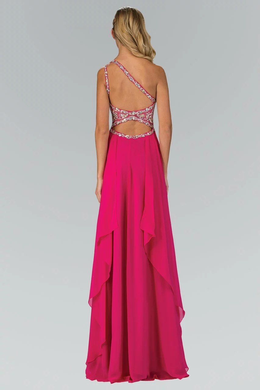 | Details: | One Shoulder, Chiffon, Beaded Bodice, Low Cutout Back with Straps, Zipper, Full-Length |