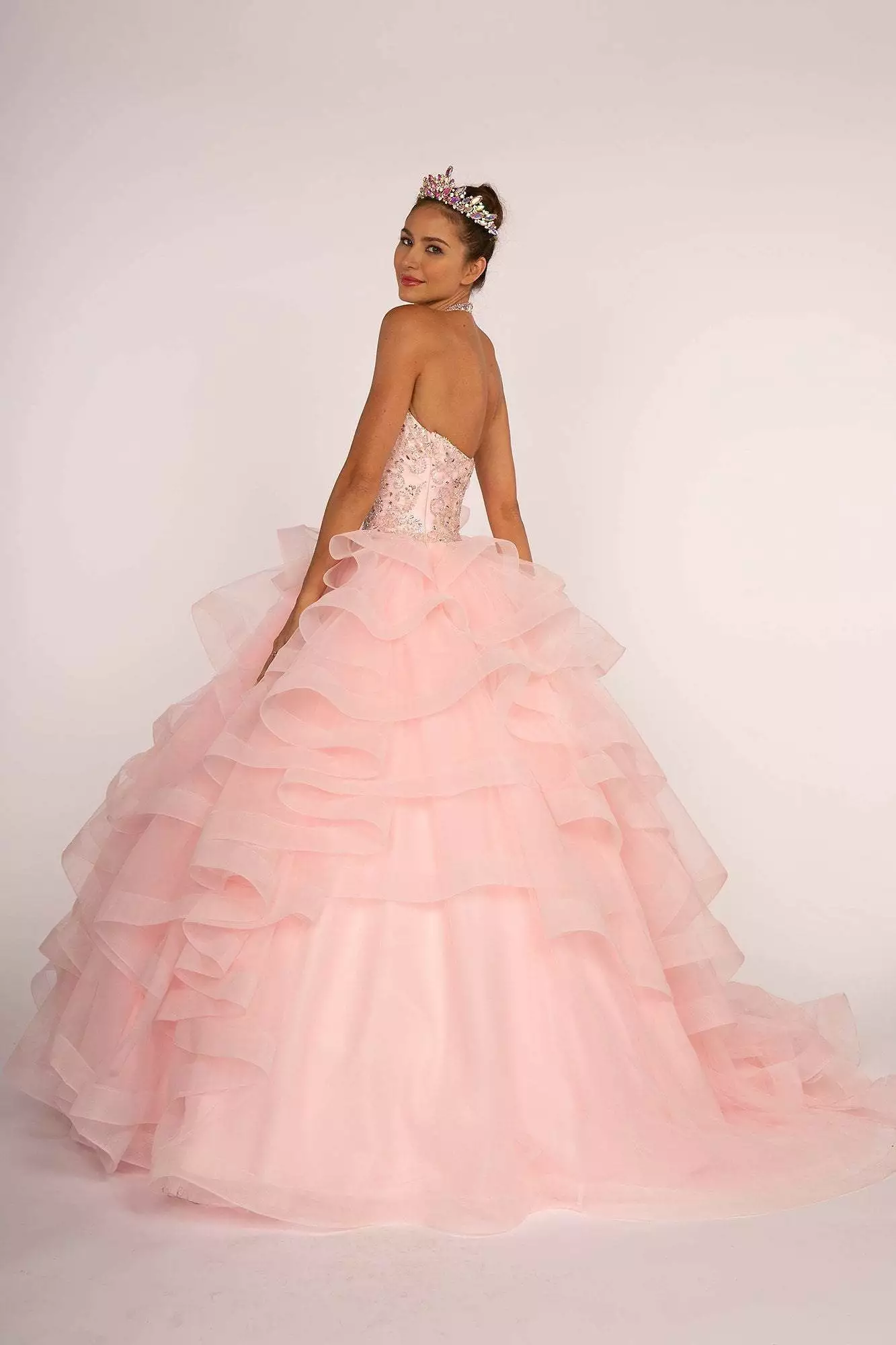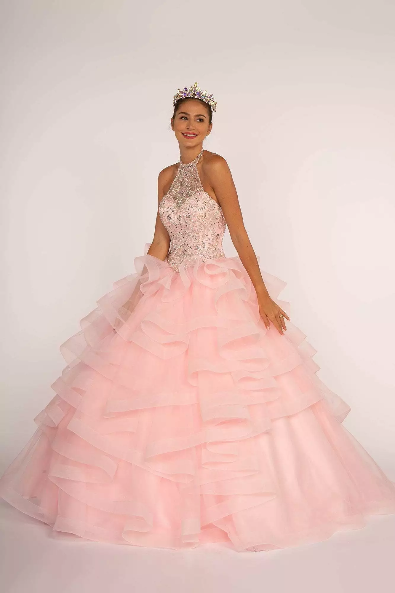 All eyes will be watching you as you take a step in an upscale Elizabeth K GL2512 creation. Sparkling with an array of faceted jewels on a sheer bodice, this fancy piece flourishes an illusion high halter neckline. Coupled with a mid-open back and lace-up corset details, the lush ballgown skirt cascades magnificently in voluminous ruffled layers that complete in a gossamer train. Exhibit an exquisitely feminine style in this beautiful Elizabeth K masterpiece. Model is wearing the Baby Pink color. Find more Corset Dresses.