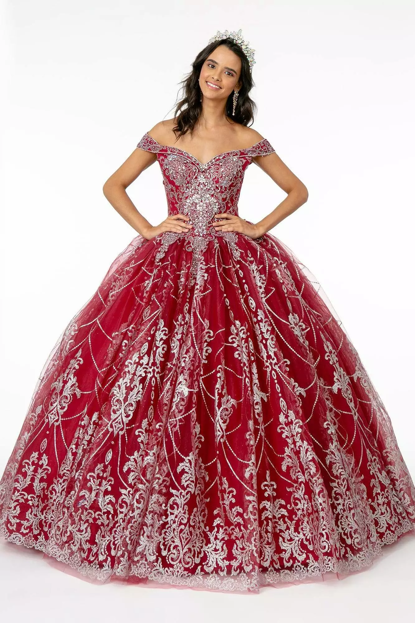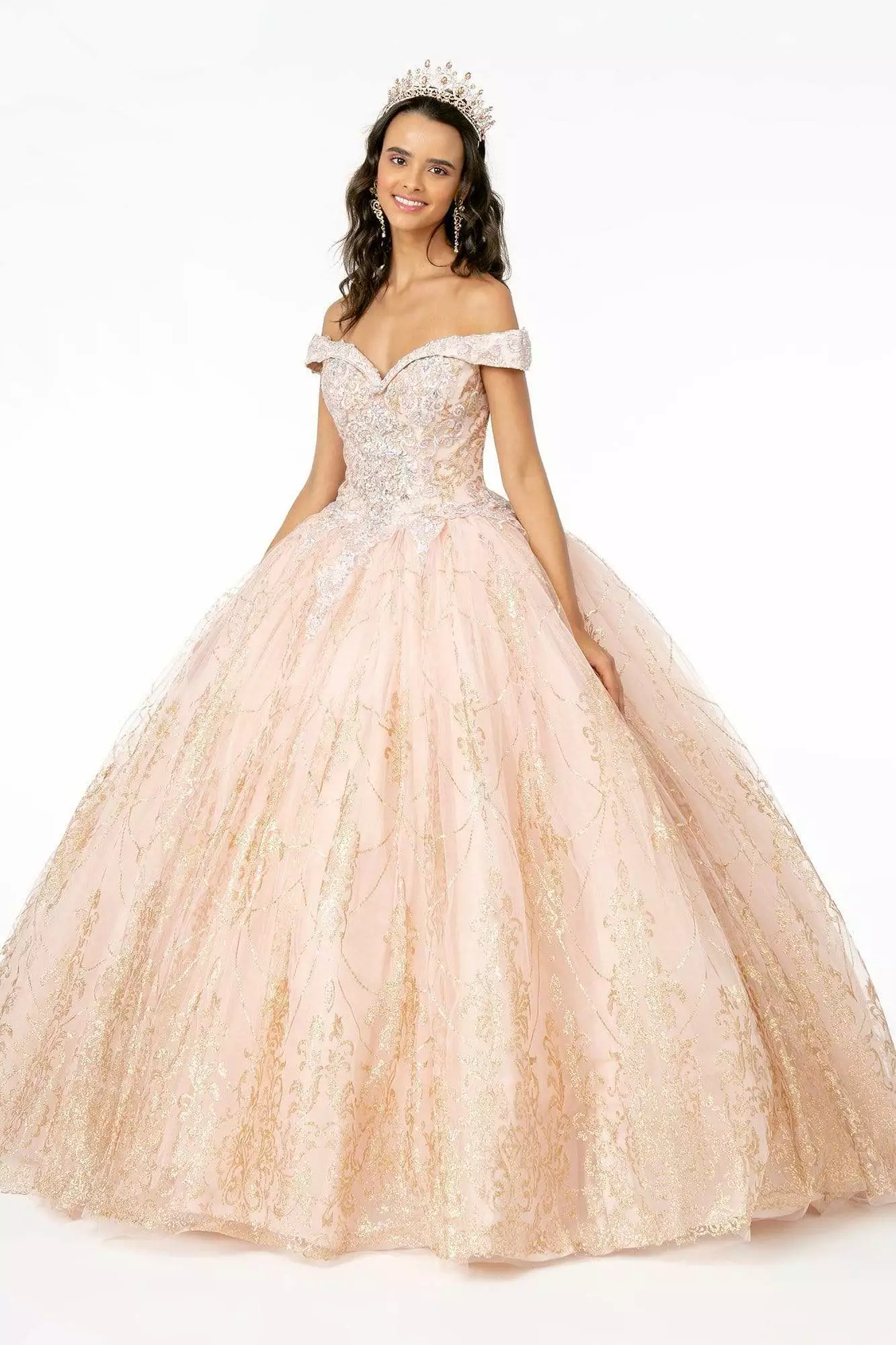 Go for full-on drama in this jaw dropping piece by Elizabeth K GL2910 masterpiece. A folded off-shoulder neckline crowns the fitted bodice, complemented with a mid-open laced up back. The whole dress is designed in crystal embellishments and glitter mesh which provide the shimmering effect. From the basque waist gives way to the pleated ballgown skirt that falls to a full length hemline. Look your absolute best in this majestic Elizabeth K ensemble. Find more sweet 16 dresses!